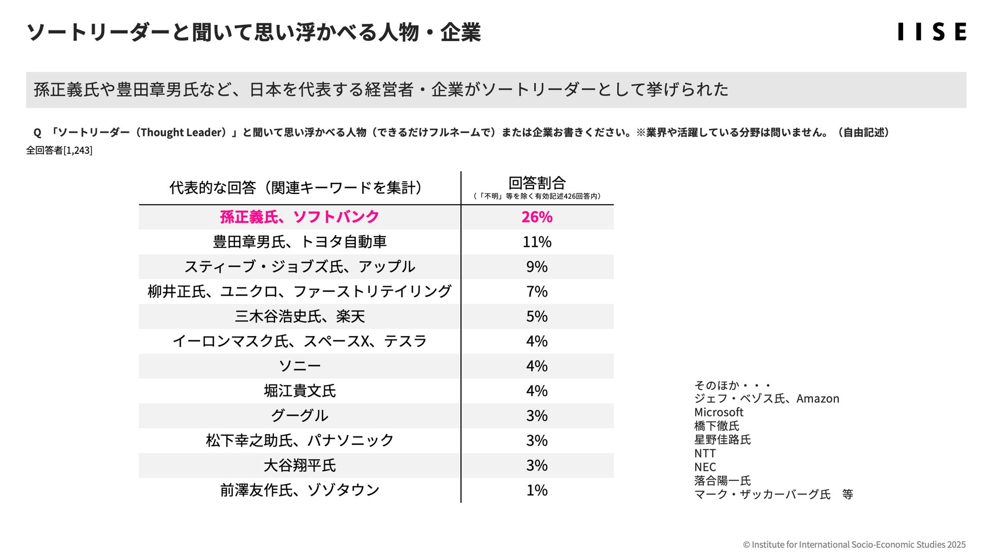 現時点においてソートリーダー像(人物や企業)は「孫正義氏(ソフトバンク)」「豊田章男氏(トヨタ自動車)」「スティーブ・ジョブズ氏(アップル)」など著名な経営者が多い