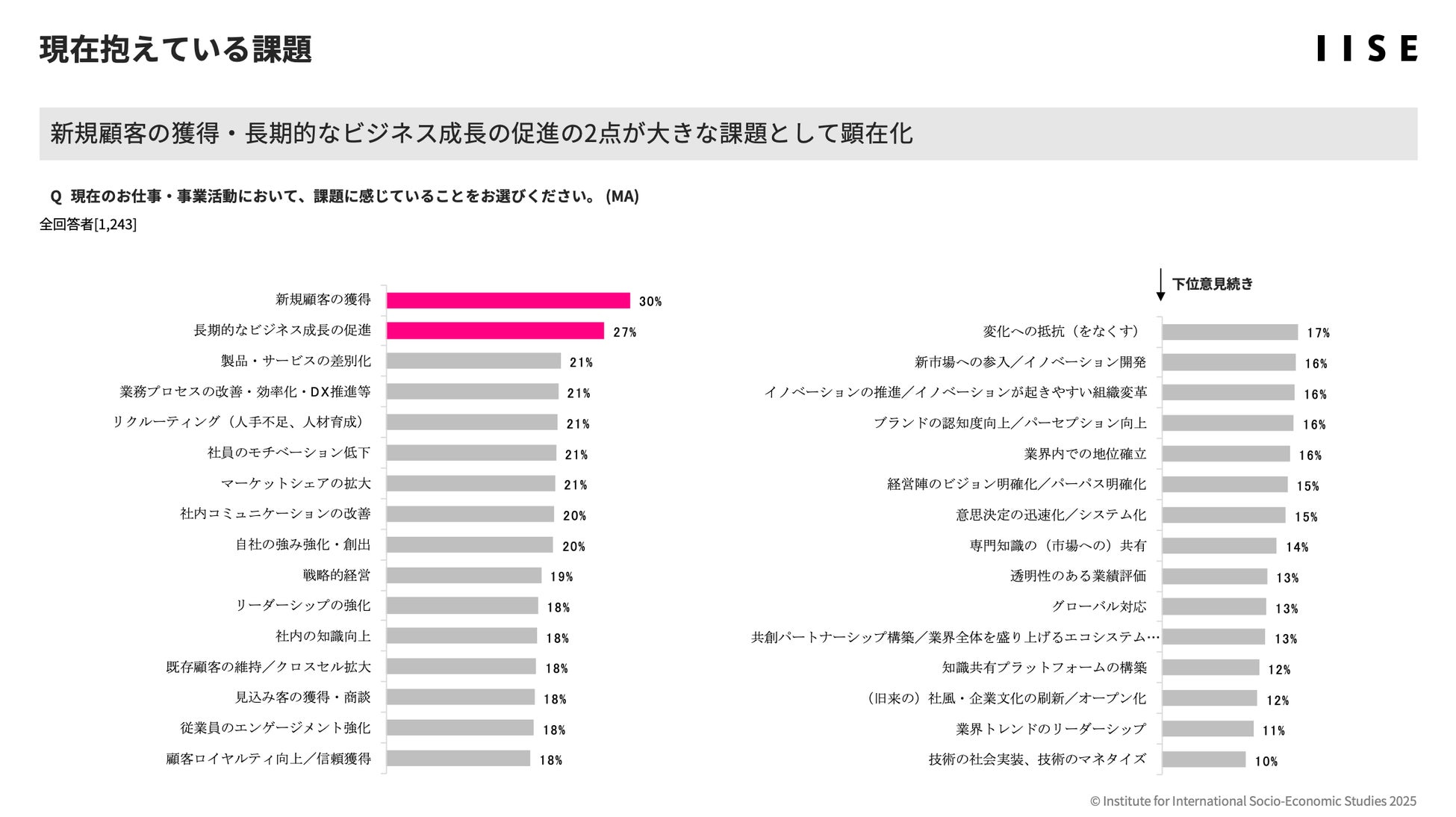 事業活動において感じている課題として「新規顧客獲得」が30%、「長期的なビジネス成長の促進」が27%と高い