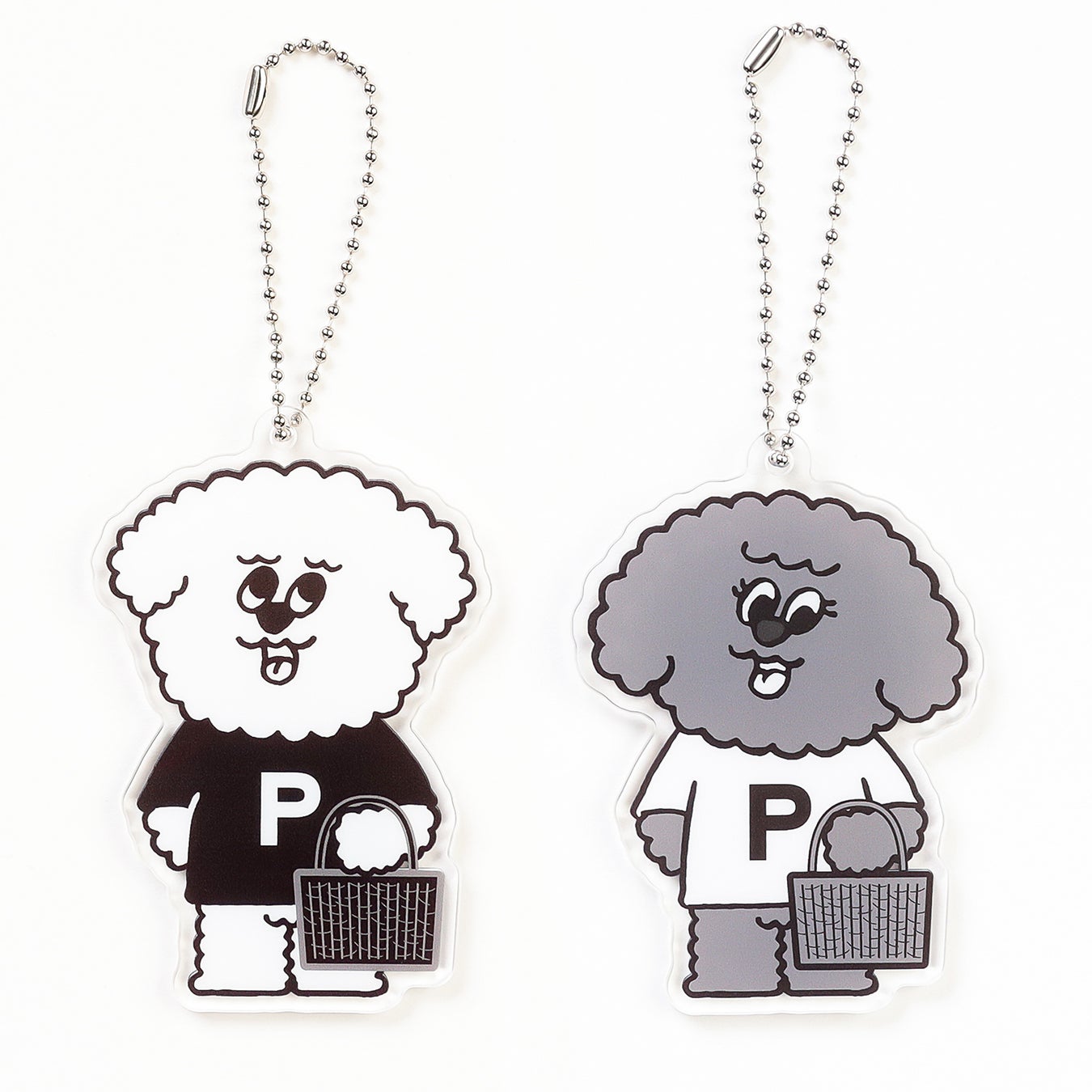 NO COFFEE™のキャラクター、エヌオくんとシオフィちゃんのアクリルキーチェーン。今回特別仕様で、pionunnalのPをTシャツに配置し、ヌビバッグを持ったスペシャル仕様。BLACKには、エヌオくんアクリルキーチェーン(pionunnal Ver.)、DARK GRAYには、シオフィちゃんアクリルキーチェーン(pionunnal Ver.)が付属。
