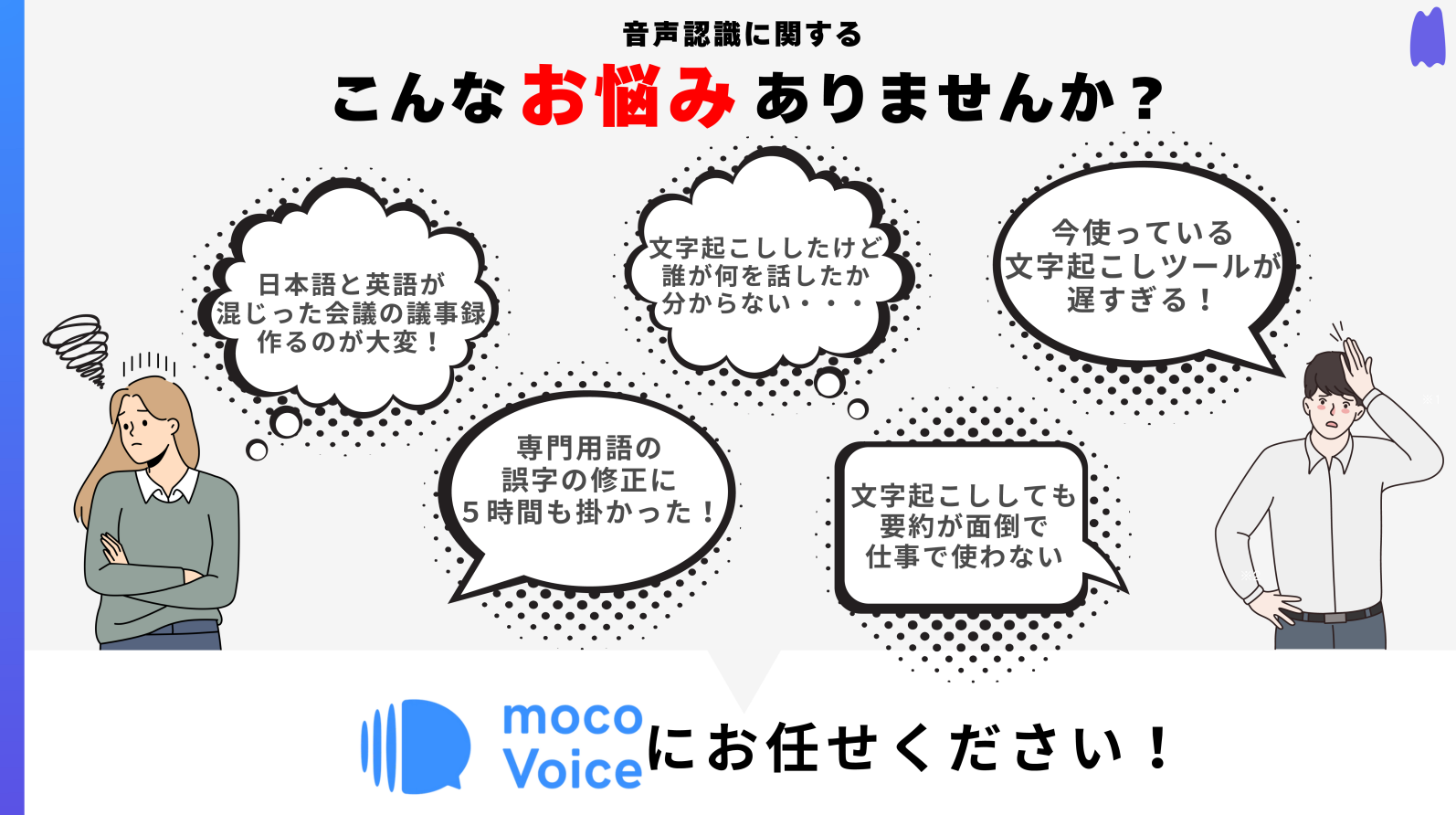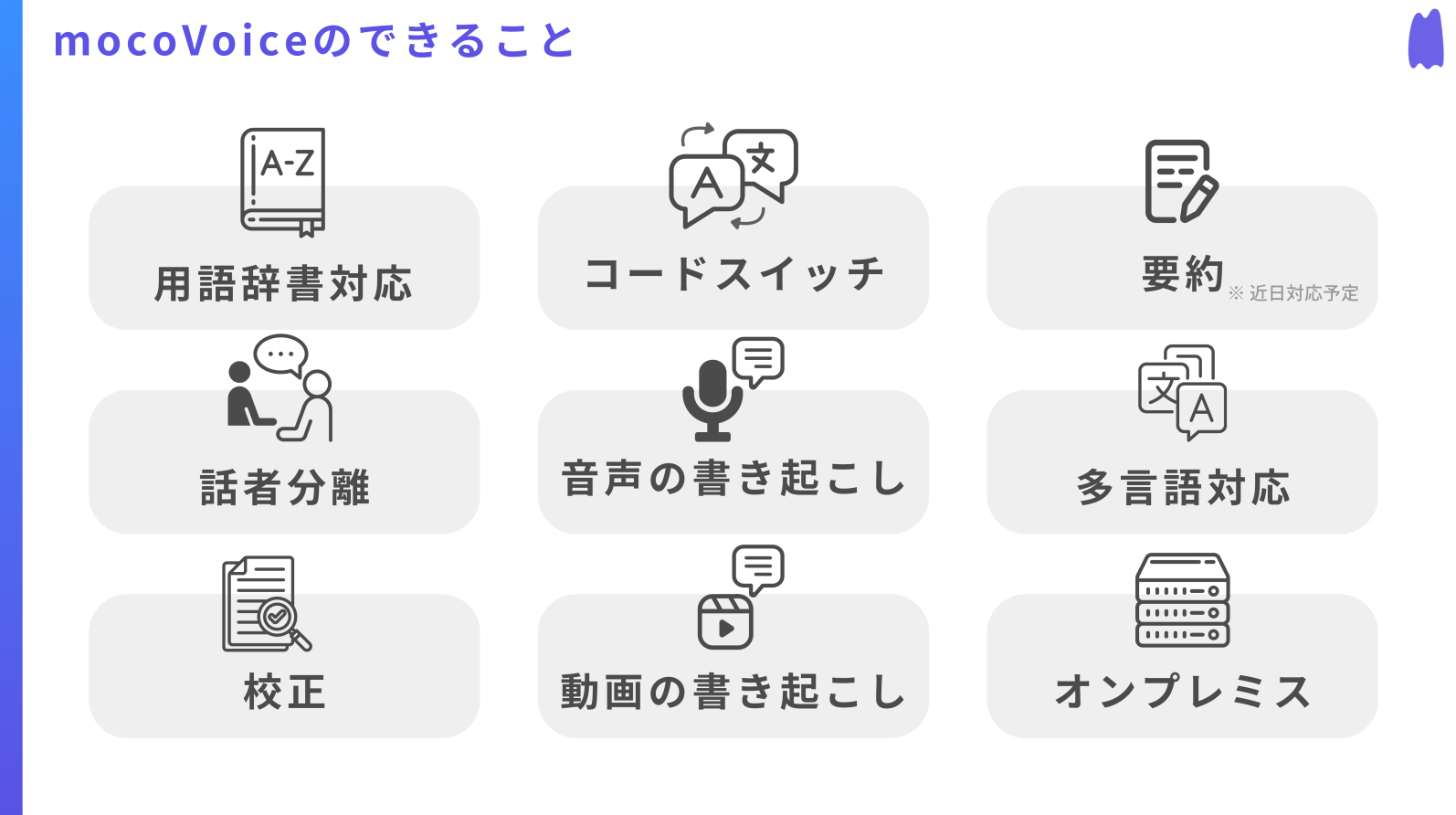 mocomoco株式会社は、高性能音声認識AI「mocoVoice」を無料で体験できるDemoサイトを公開したことをお知らせいたします。本サイトでは、音声認識をはじめとした多彩な機能を実際に試すことができ、mocoVoiceの圧倒的な性能を体感していただけます。