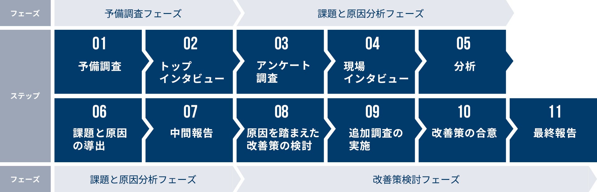再発防止プロセスやそれを取り巻くリスクガバナンス・カルチャーを徹底調査・評価し、本質的な課題特定を行い、現実的かつ効果的な解決策を提示するサービスです。提示した解決策に対して、最終的には自律自走できるようになることを念頭に置きつつ、改善策の導入や運用を支援します。
