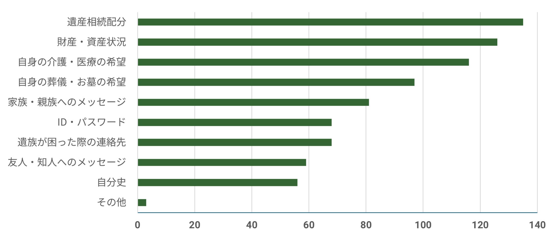 結果、「遺産相続配分」「財産・資産状況」が多く、金融資産関連が上位となりました。金融資産については自身でも正確に把握していない部分があり、詳細な起債に苦労している姿が浮かび上がります。