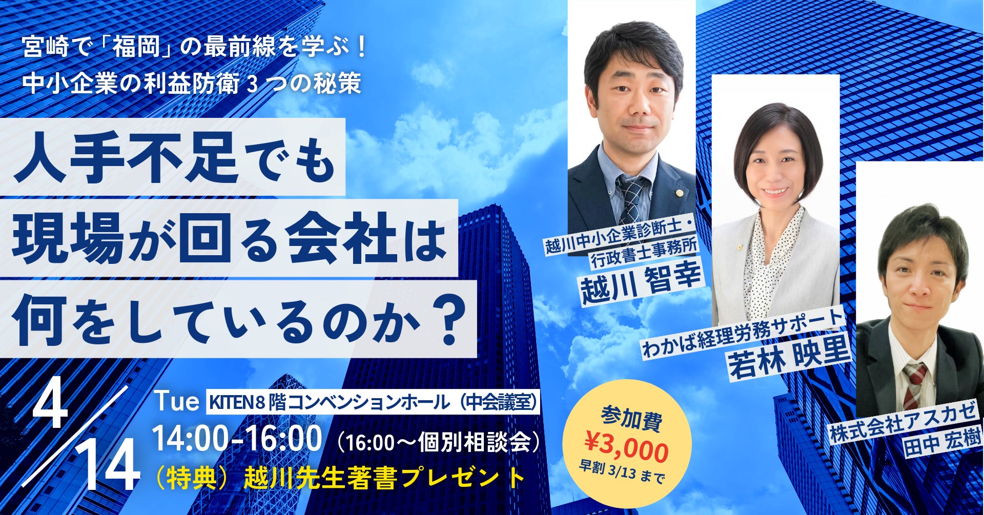 株式会社アスカゼ(本社:宮崎県、代表:田中宏樹)は、2026年4月14日(火)、宮崎県の中小企業経営者を対象としたセミナー「人手不足でも現場が回る会社は何をしているのか?」を開催いたします。