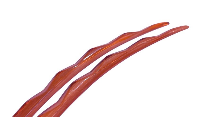 トップにファセットカットを施したTHBTオリジナルUヘアピン。裏面にはダイヤモンド風の模様がカービングされ、アクリルの奥からプリズムのように透けて見えるユニークなデザインです。