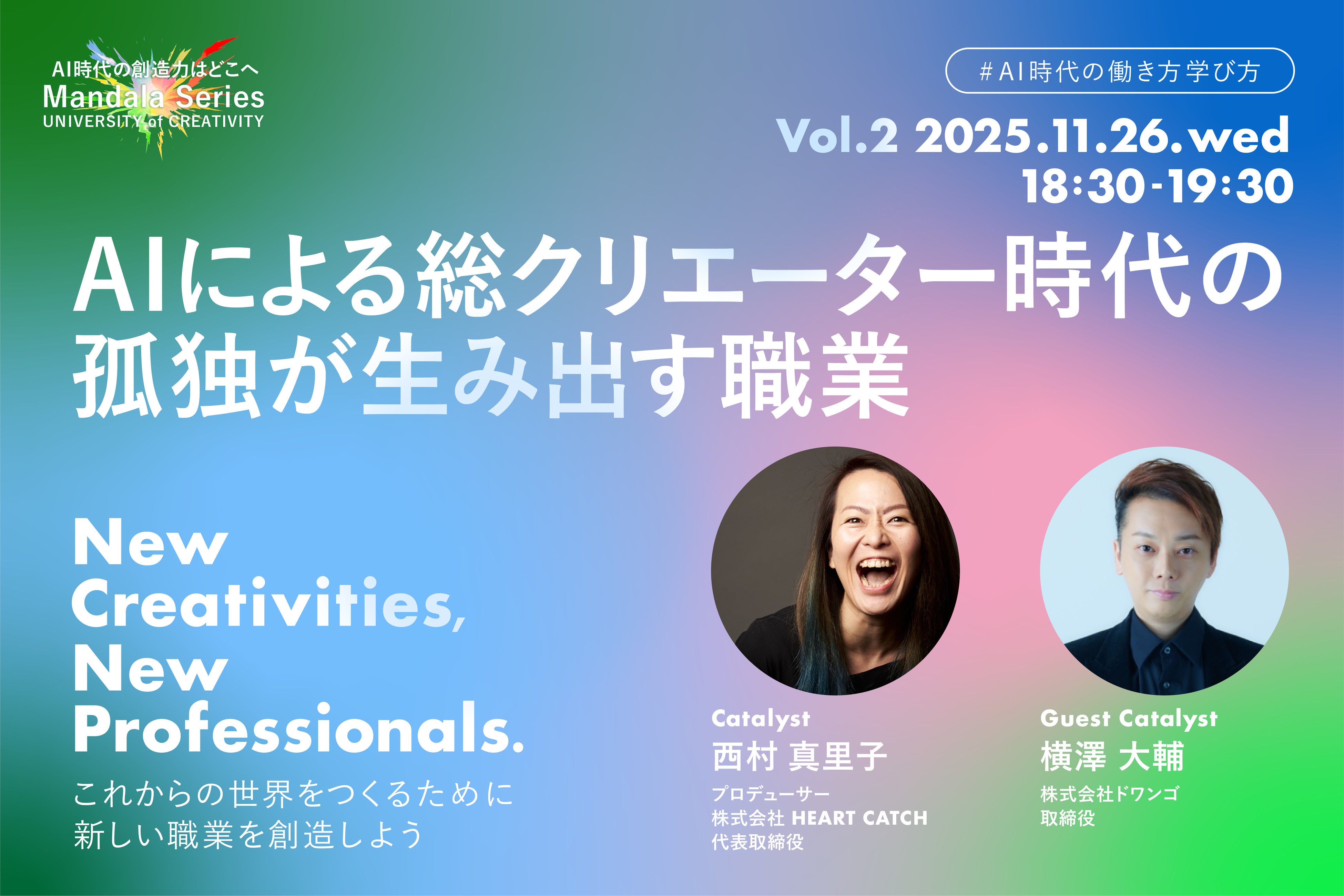 AI時代の新しい働き方・学び方を考える「New Creativities, New Professionals.」では、西村真里子さん(株式会社 HEART CATCH 代表取締役 ) をメインカタリストとして、毎回異なるゲストをお招きするトークセッション形式で、これから生まれる新しい職業や学びの形をディスカッションするMandalaシリーズを開催。後日対話の内容はレポートの形式にして、対話から出てきたポイントを集約し皆様にお届けします。無料でご参加いただけます。お席には限りがあるのでお早めにお申し込みください(オンライン配信はございません)。