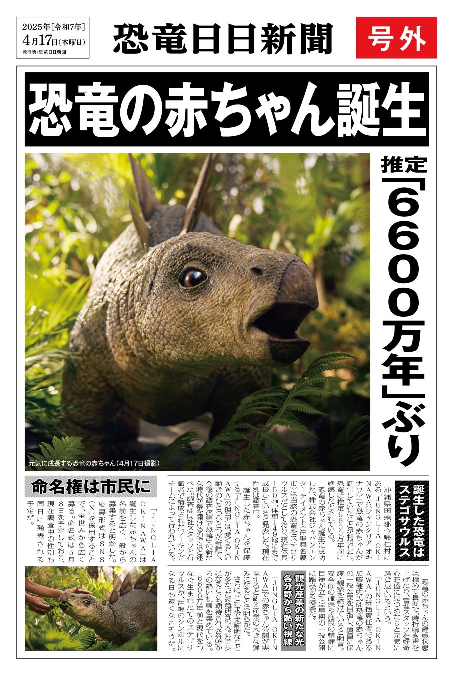 推定6600万年ぶり 恐竜の赤ちゃん誕生!沖縄北部「ジャングリア沖縄」で発見・保護ステゴサウルスとみられる可愛い赤ちゃん恐竜の名前を一般公募本日4月17日 (恐竜の日)数量限定 東京・渋谷で号外配布