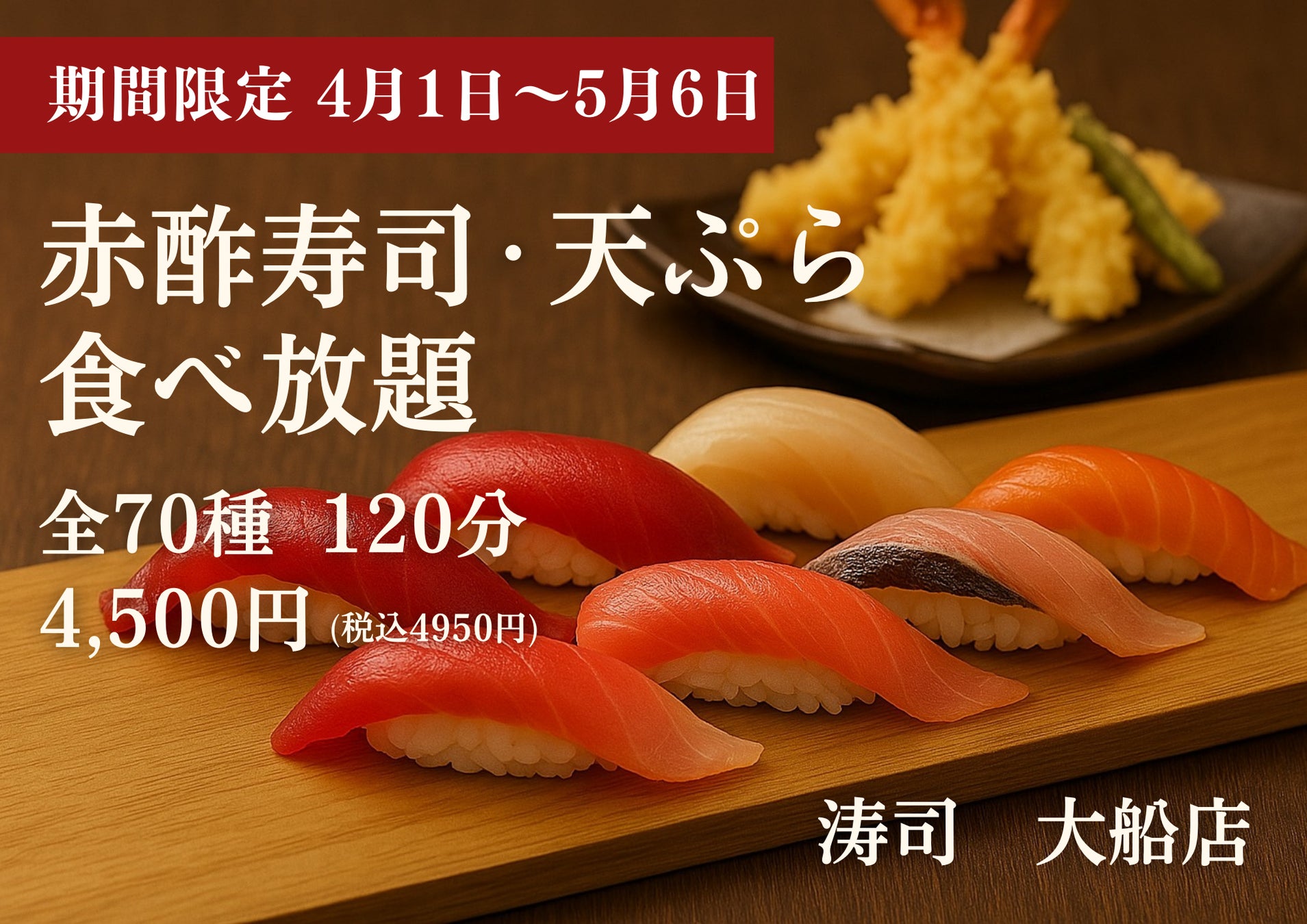 本格江戸前寿司&こだわり天ぷら、サイドメニュー全70種類の120分食べ放題を『涛司_TOJI 大船店』で4月~GWも実施します!