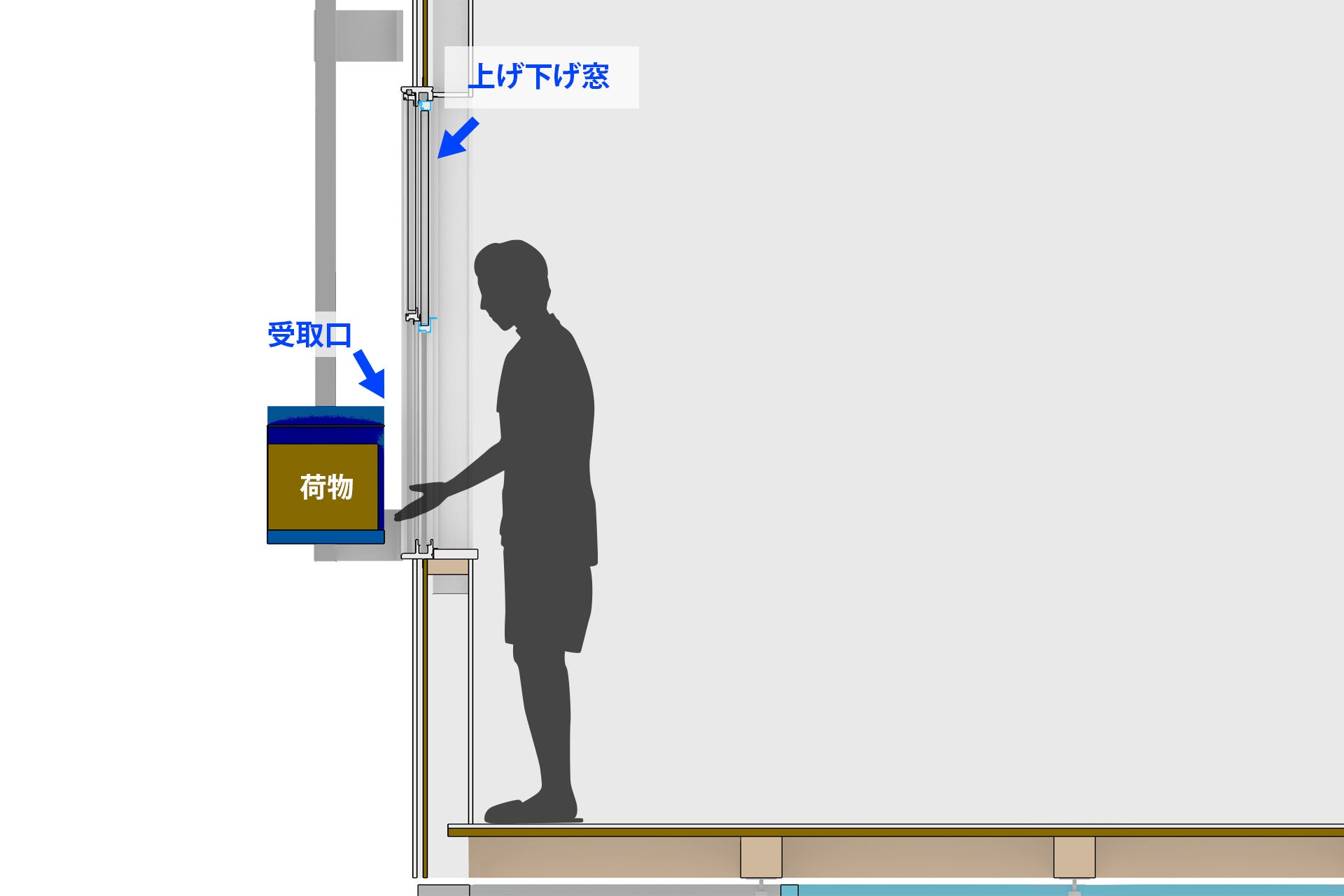 荷物を室内に引き込むための開口部として、エレベーターを設ける位置にはあらかじめ所定の上げ下げ窓を設置します。これにより、エレベーター実装時に外壁への新規穴あけ工事が不要となるよう準備します。