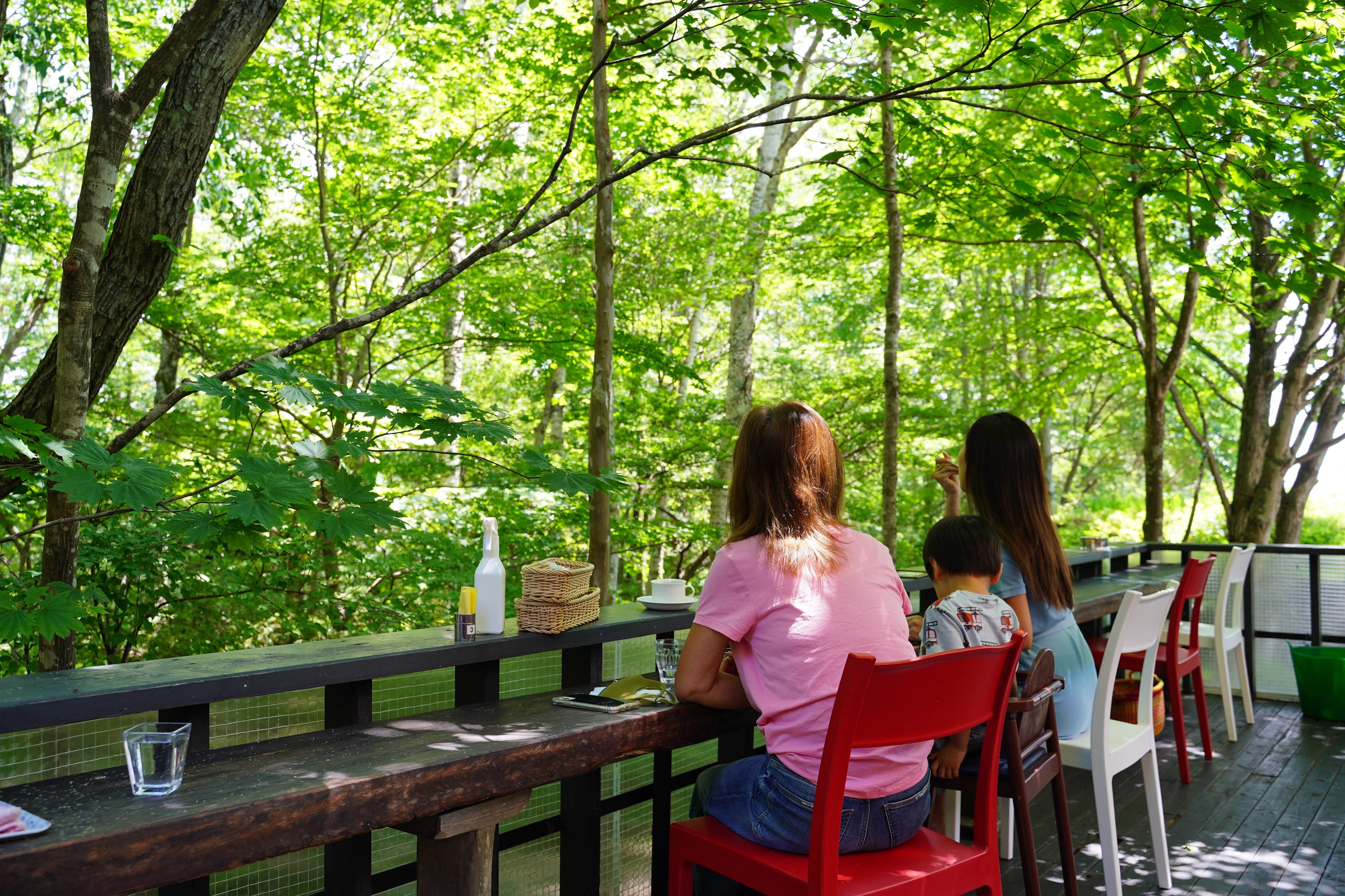 季節で移りゆく森の景色を眺めながら、室内、テラス席とお好きな席でゆったりとお過ごしいただけます。ワンちゃん連れのお客様もテラス席をご利用いただけます!