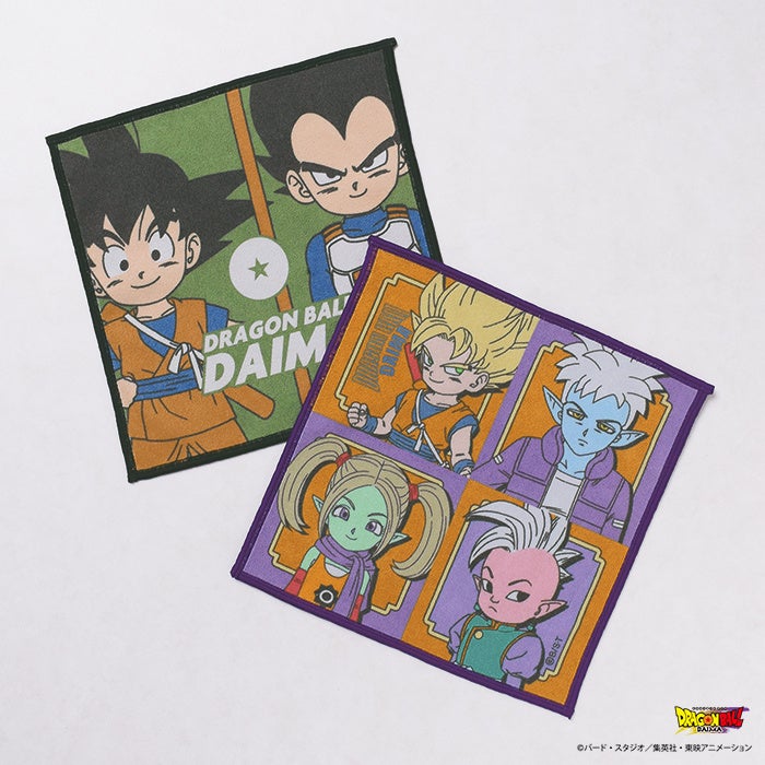 コンパクトに持ち運べるハンドタオル。悟空(ミニ)&ベジータ(ミニ)のシンプルデザインと、超サイヤ人悟空(ミニ)、界王神(ミニ)、新キャラクターのパンジ、グロリオの4キャラが入ったデザインの2種展開です。