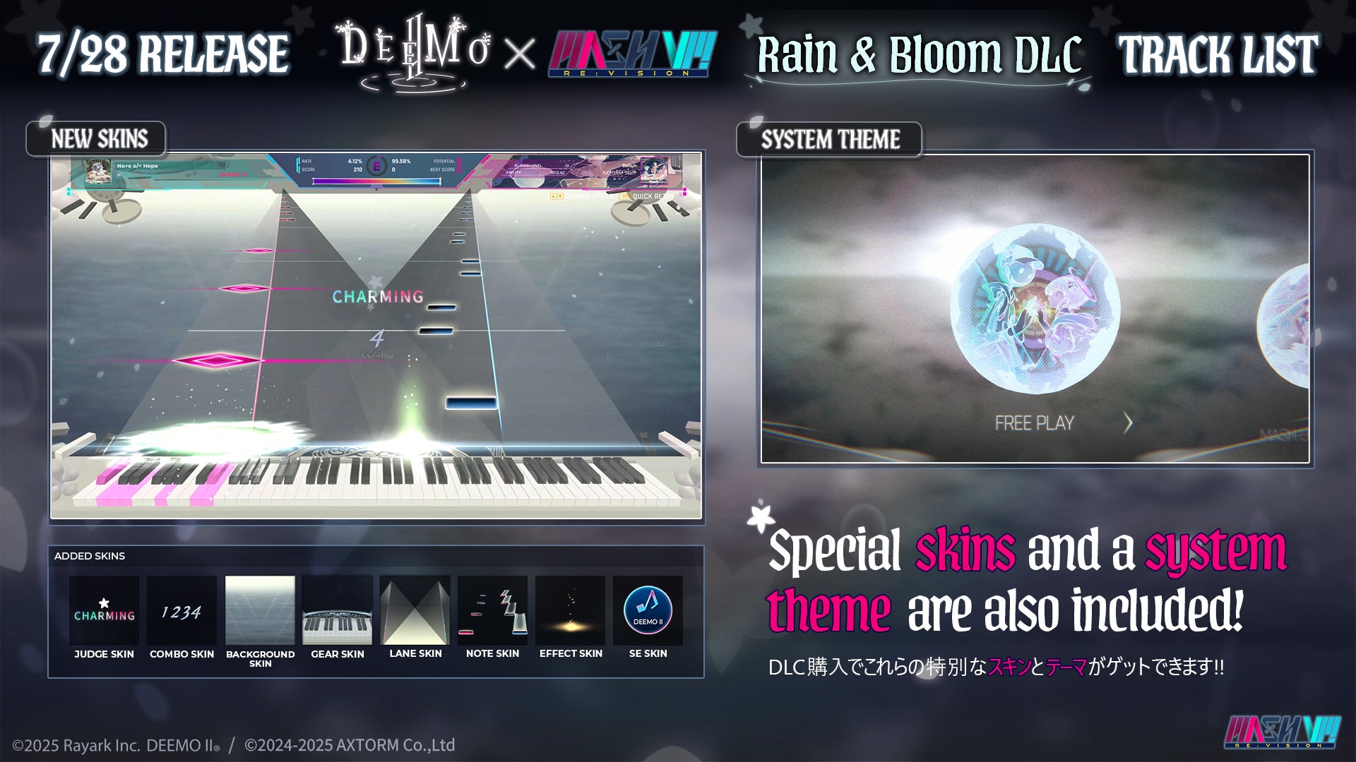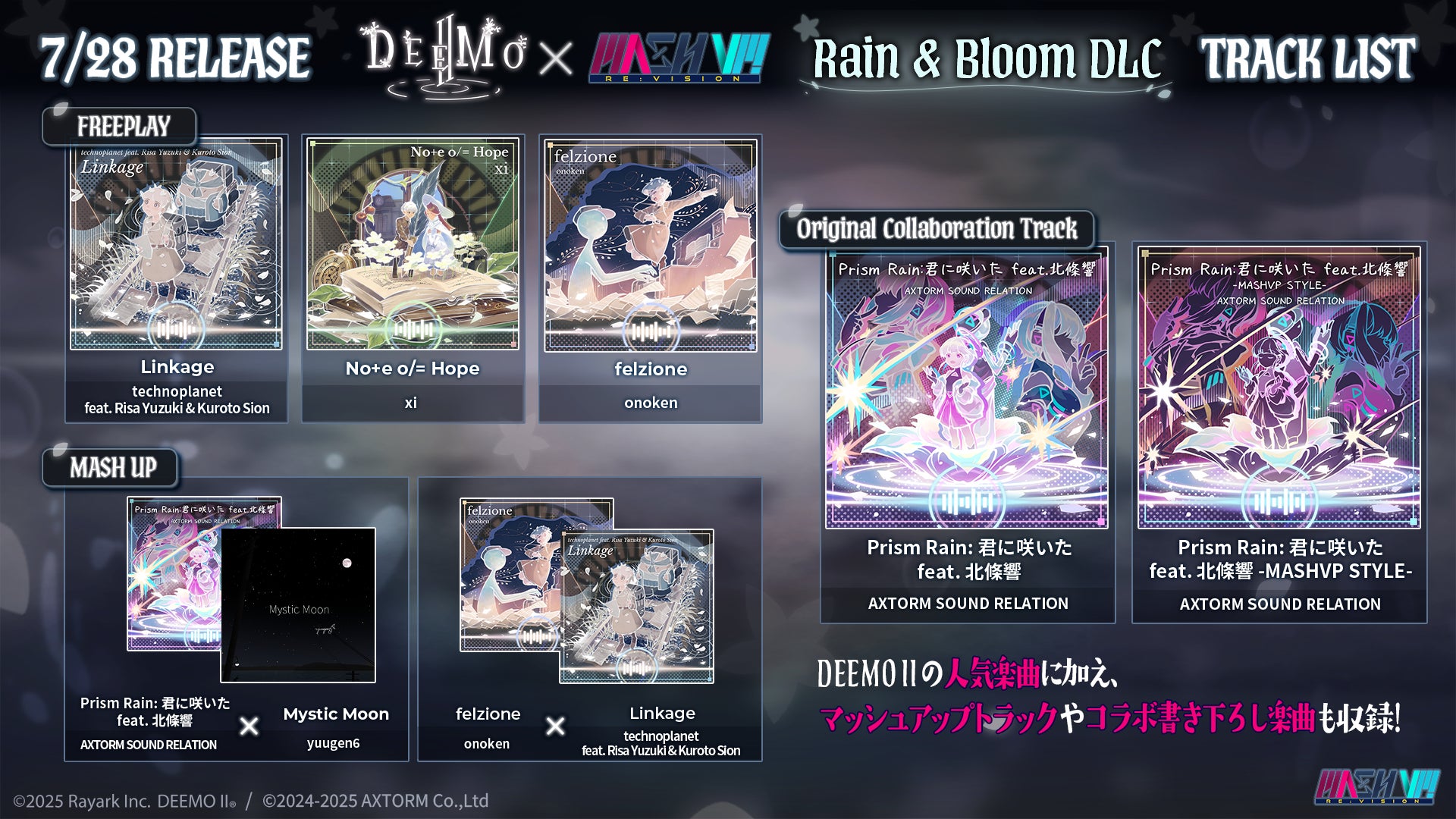 こちらのDLCも、DEEMO IIのオリジナル楽曲はもちろん、コラボ記念楽曲「Prism Rain: 君に咲いた feat.北條響 / AXTORM SOUND RELATION」や、DEEMO II楽曲同士のマッシュアップトラック「Linkage x felzione」など、リズムゲームファンは見逃せない特別なマッシュアップトラックを収録。