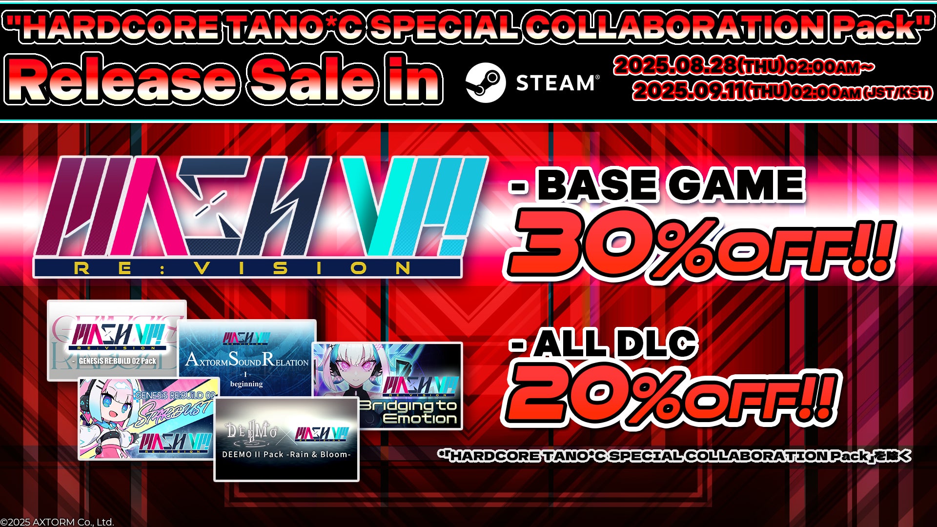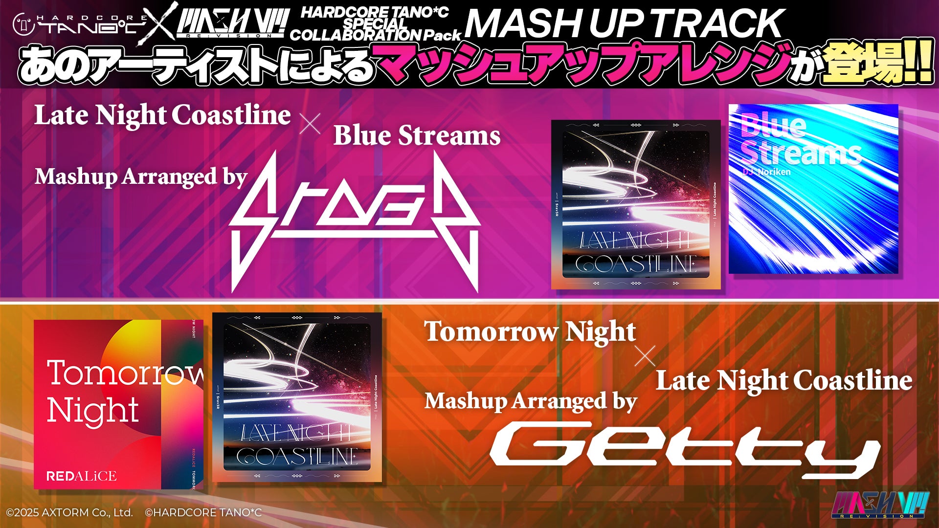 株式会社AXTORM(本社:東京都港区)は、PC向け音楽ゲーム『MASH VP! Re:VISION』にて、音楽制作集団 「HARDCORE TANO*C」とのコラボDLC『MASH VP! Re:VISION - HARDCORE TANO*C SPECIAL COLLABORATION Pack』を8月28日(木)より販売開始いたします。