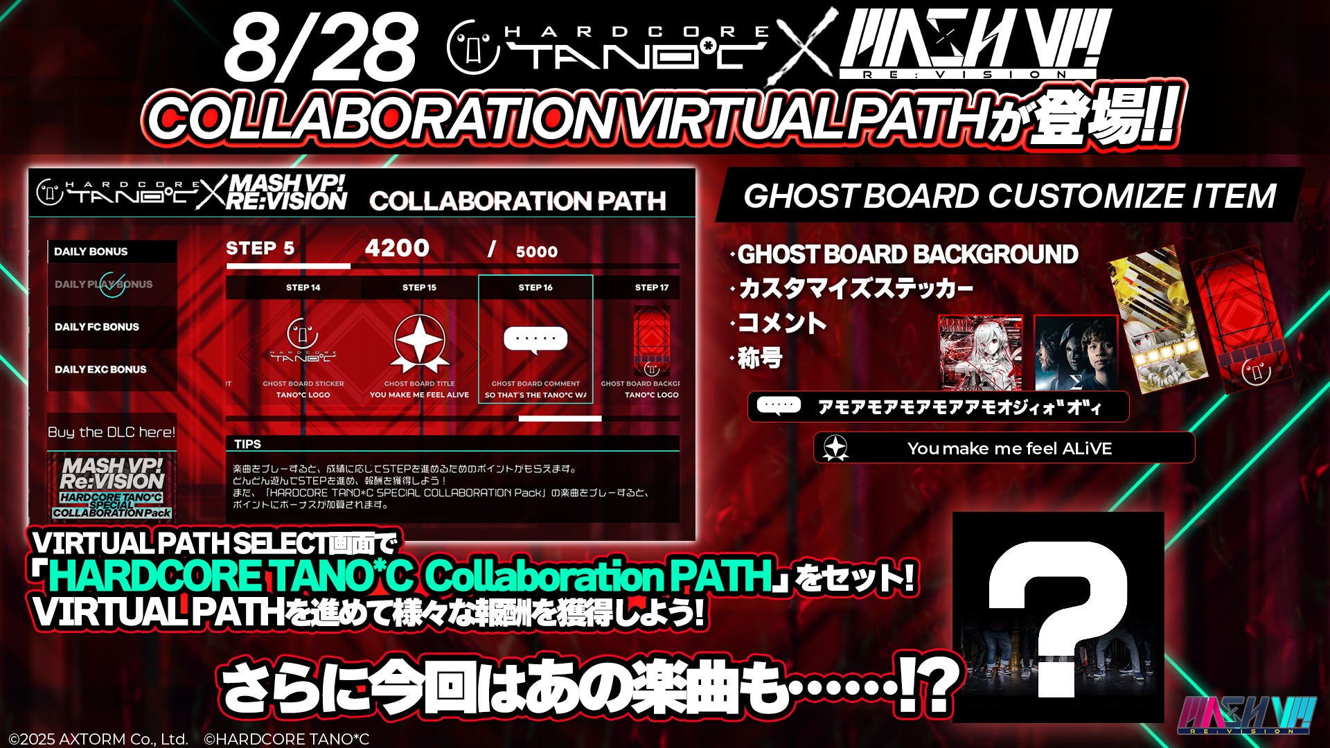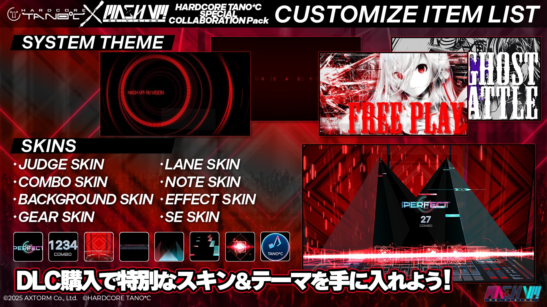 今回のDLCには、「ALiVE / REDALiCE」や「You & DIE / USAO」をはじめ、HARDCORE TANO*Cの人気楽曲を計7曲収録!