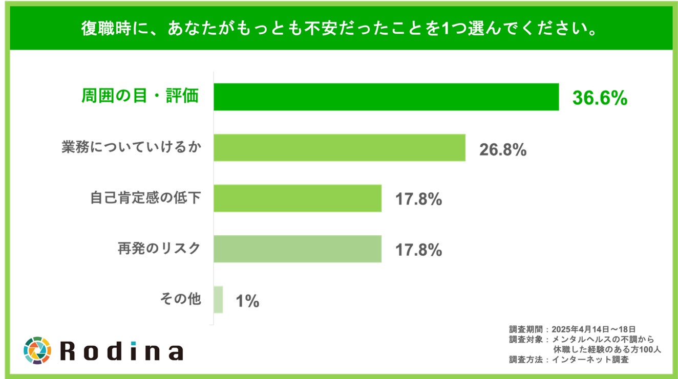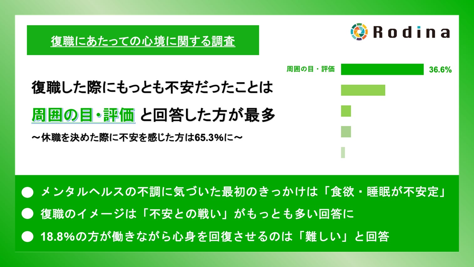 復職・就職を支援し、リワーク事業を展開する株式会社Rodina(本社:広島県広島市、代表取締役:山田 康輔)は、メンタルヘルスの不調から休職した経験のある方100 名を対象とし、復職にあたっての心境に関する調査を実施いたしました。
