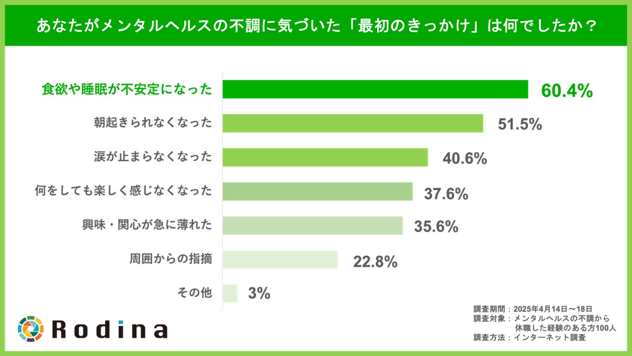 ・メンタルヘルスの不調に気づいた最初のきっかけは「食欲・睡眠が不安定になった」