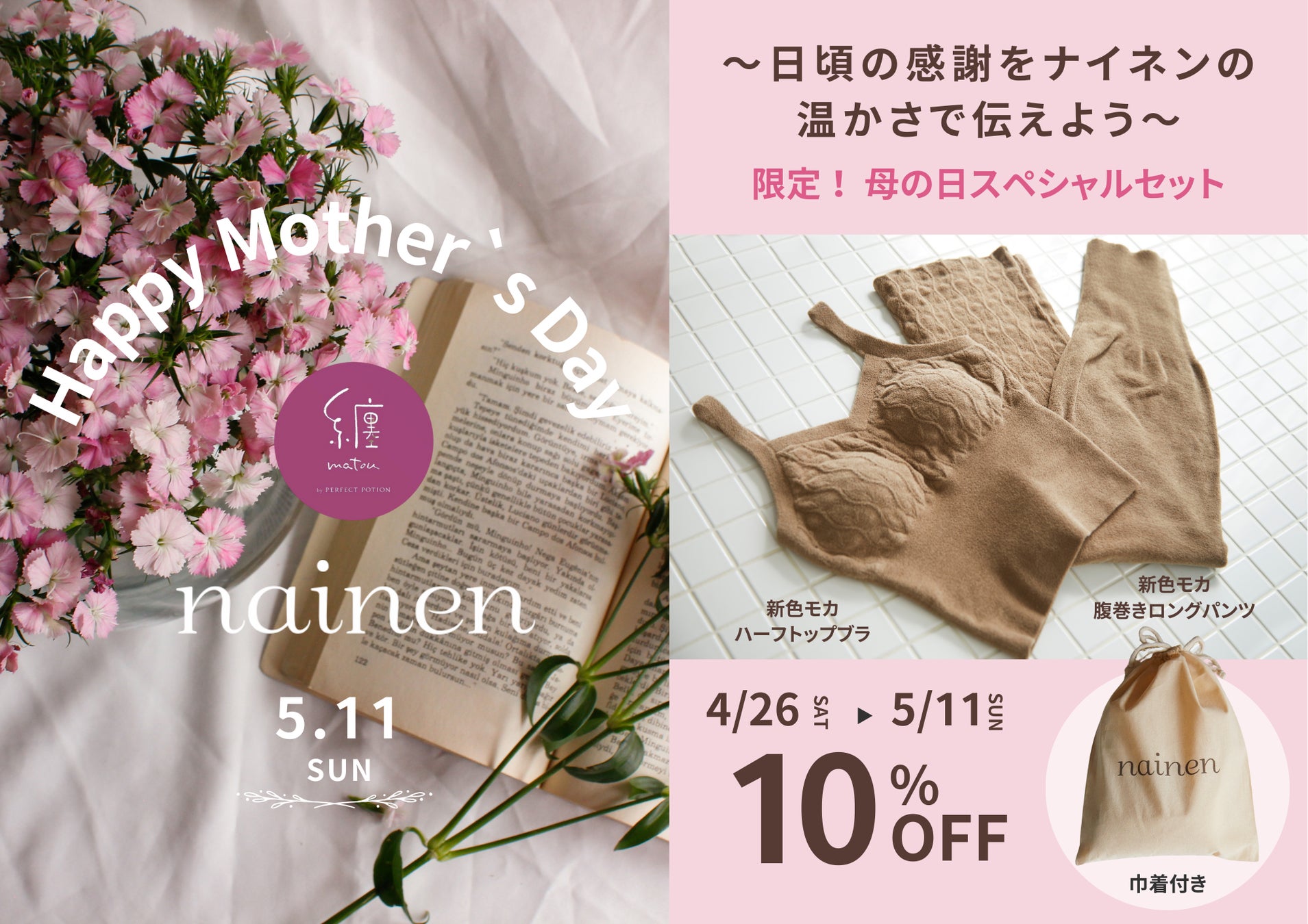 “温もりをまとう”ことができる唯一のニットランジェリーブランド「nainen(ナイネン)」を展開する株式会社 Hana Plan(本社:東京都渋谷区 代表取締役:花村 幸栄 以下ハナ プラン)は、母の日スペシャルギフトセットを発売します。
