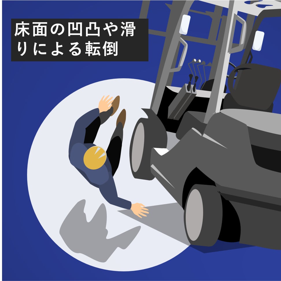 床面の凸凹や滑りによる転倒で投げ出され、転倒時にフォークリフト車輪へ巻き込まれる事故。