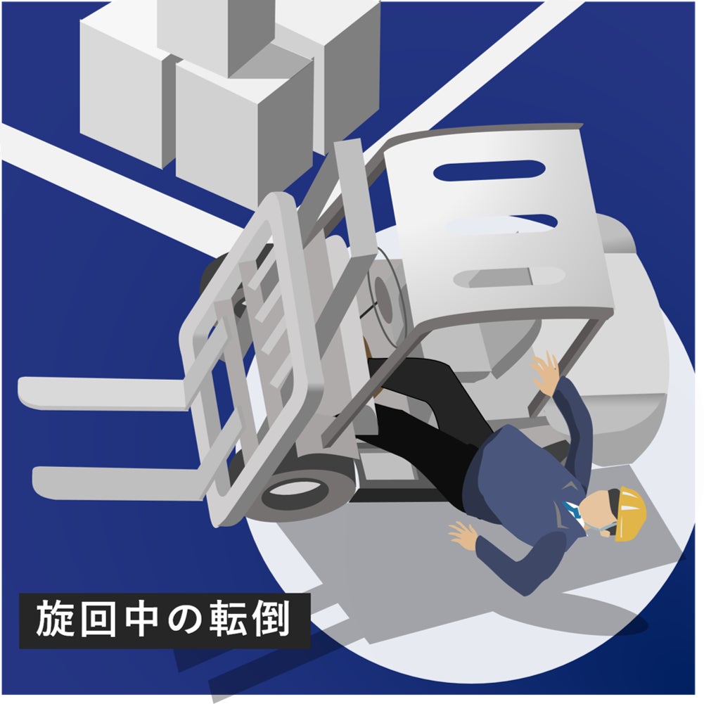 フォークリフトが急旋回中に横転。運転者が車外に投げ出され、下敷きになる事故。