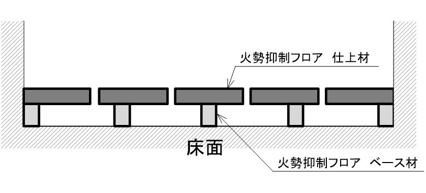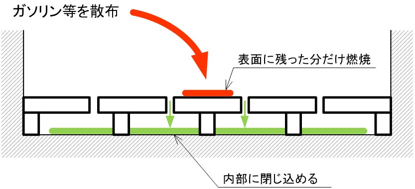 多数の穴の開いた「仕上材(床表面部)」とガソリンを閉じ込める「ベース材」の2層で構成されている「ArtiedgeⅡ」を床に敷き詰めることにより、ガソリンが散布されても大部分は床下に落ちて燃焼せず、床表面部に残ったごく一部のガソリンのみの燃焼となるため、大幅に火炎の勢いを抑えることができます。