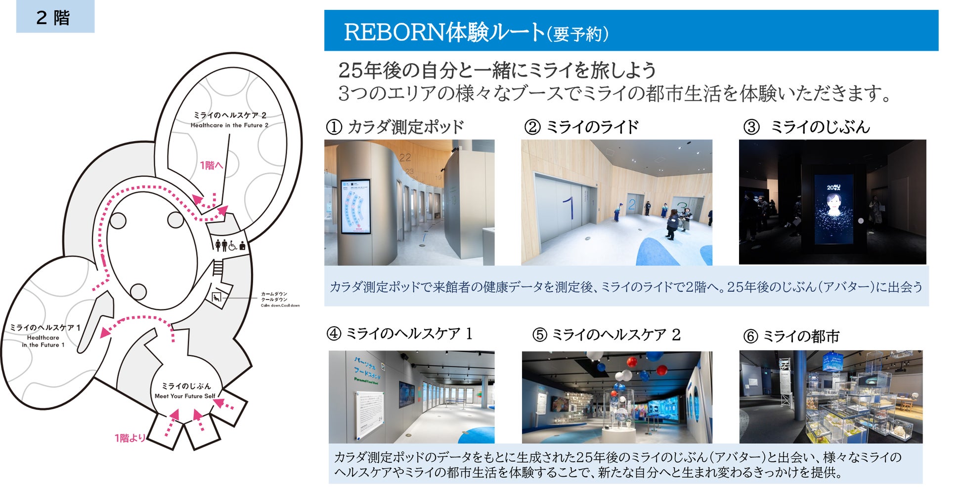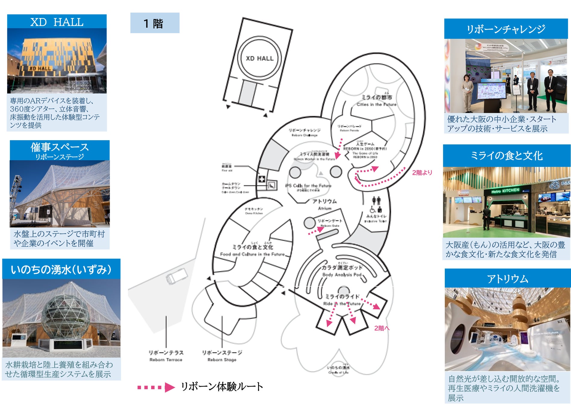 大阪が持つ強みを活かして、最先端の医療技術やライフサイエンス産業が 創り出す近未来への期待を高め、さらには食や文化、観光などによる交流を促進する場となるよう、『ミライの都市生活』をテーマに展開します。主な展示体験の一つである「リボーン体験ルート」では、「カラダ測定ポッド」を使って、「目」や「髪」、「心血管」など、7つの項目を測定します。そのデータをもとに生成した25年後の姿のアバターに出会い、その後、ミライのヘルスケアや都市生活を体験できるブースをめぐることで、新たな自分へと生まれ変わるきっかけを提供します。その他にも、中小企業やスタートアップの技術力や魅力発信を行う「リボーンチャレンジ」、大阪の食文化を発信する「ミライの食と文化」ゾーン、ミライのエンターテインメントが体験できる「XD HALL」など、来館者の皆さまがワクワクするような展示を行います。