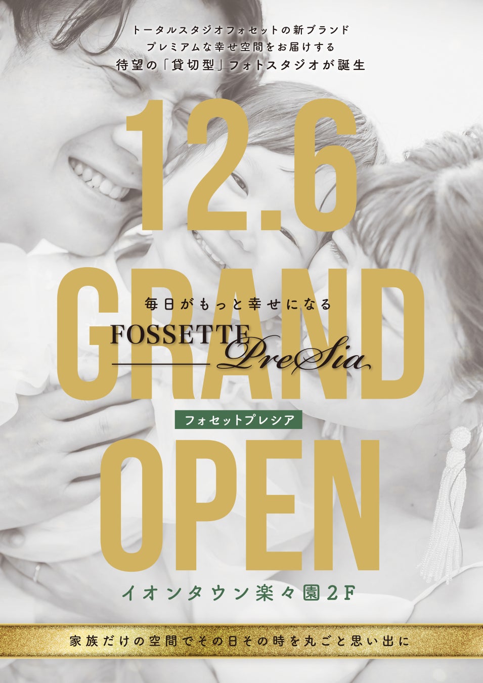株式会社スタジオアイ(本社:広島県呉市、代表取締役社長:相川真太郎 以下スタジオアイ)が展開するフォトスタジオブランド『トータルスタジオフォセット』の新ブランド『フォセットプレシア』がイオンタウン楽々園(広島市佐伯区)に、2024年12月6日(金)グランドオープン致します。