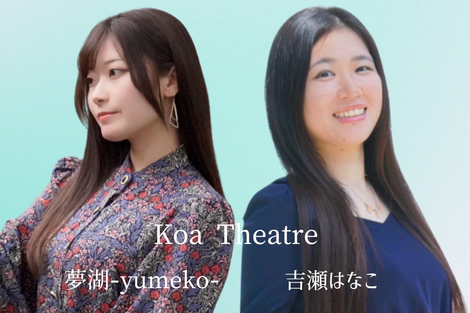 ミュージカルユニット KoaTheater(コア・シアター):「夢と魔法を、あなたのそばに」は、埼玉・東京を拠点に、あなたの街で身近なワクワクをお届けするミュージカルボーカルユニットです。主宰の夢湖(ゆめこ)率いる、ボイススクールKoaVoiceLabで本格的に歌を学ぶメンバーやプロシンガーたちが、名作ミュージカル作品やディズニー、スタジオジブリ、オリジナル物語音楽作品を歌います。情緒豊かなハーモニーであなたを物語の世界へお連れします。