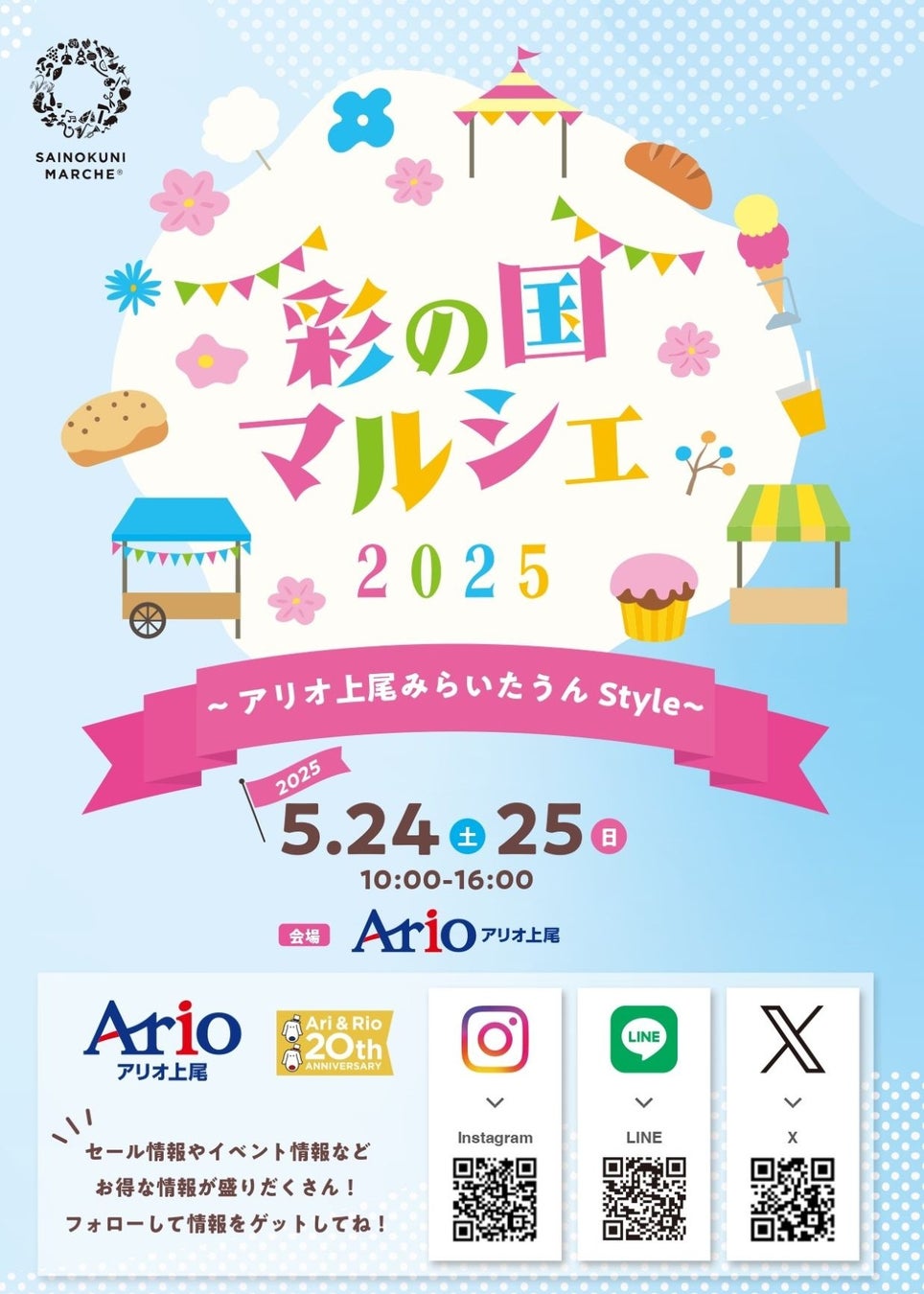 NPO法人 彩の国地域活性化協会(拠点:埼玉県さいたま市、代表理事:佐々木 輝伸)が主催する「彩の国マルシェ」は、2025年5月24日と25日の2日間、埼玉県上尾市にあるアリオ上尾にて「彩の国マルシェ~アリオ上尾みらいたうんStyle~」を開催いたします。