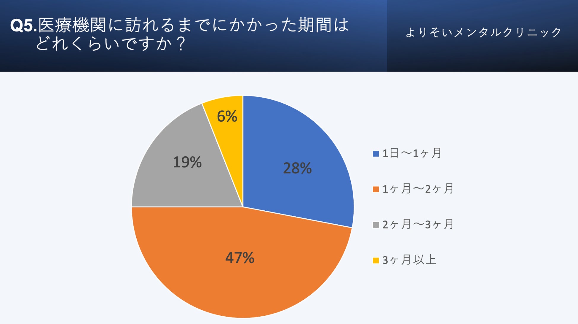 その結果、医療機関に訪れるまでにかかる期間は1〜2ヶ月が最も多い回答でした。