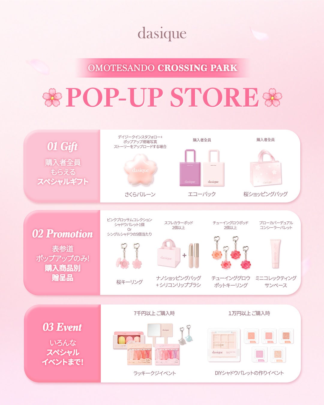 ポップアップストアで商品をご購入いただいた方全員に、「dasique」のロゴが入ったエコバックや桜の絵柄が入った限定ショッピングバックなどをプレゼント!さらに、日本初上陸商品をご購入いただいた方には、「桜キーリング」と「チューインググロウポットキーリング」のプレゼントなど、ご購入商品別のスペシャルギフトなどもご用意しています!7,000円(税込)以上ご購入いただいた方には、デイジーク手鏡やリップグロスミニキットなどが当たるラッキーくじイベントや、10,000円(税込)以上ご購入いただいた方には、韓国ソンスにあるフラッグシップストアでしか体験できなかったDIYパレットイベントも実施いたします。ぜひこの機会に「dasique」の気になる商品をゲットして、スペシャルギフトもお楽しみください。