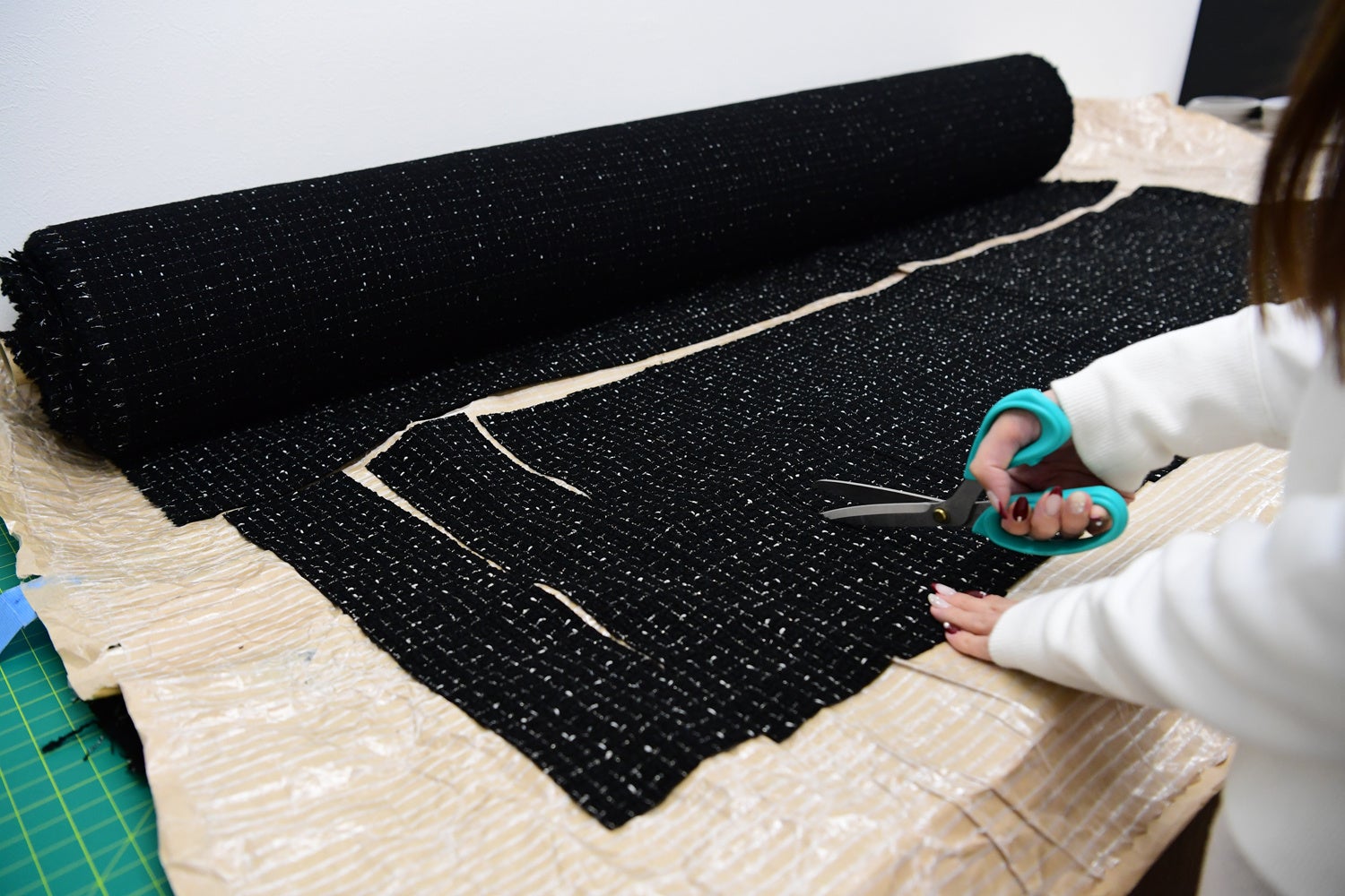 さらにクッション材を間に挟んだ状態で、ほつれのない仕上がりと柄を均一に整えて仕立てる工程には、高度な職人技術が不可欠です。