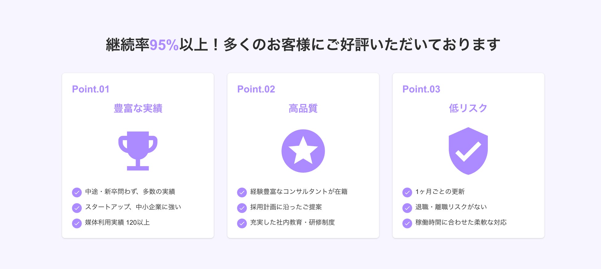 内製人事の採用・育成コストを抑えつつ、契約更新は月ごと。離職リスクゼロで必要な工数だけ確保。 |