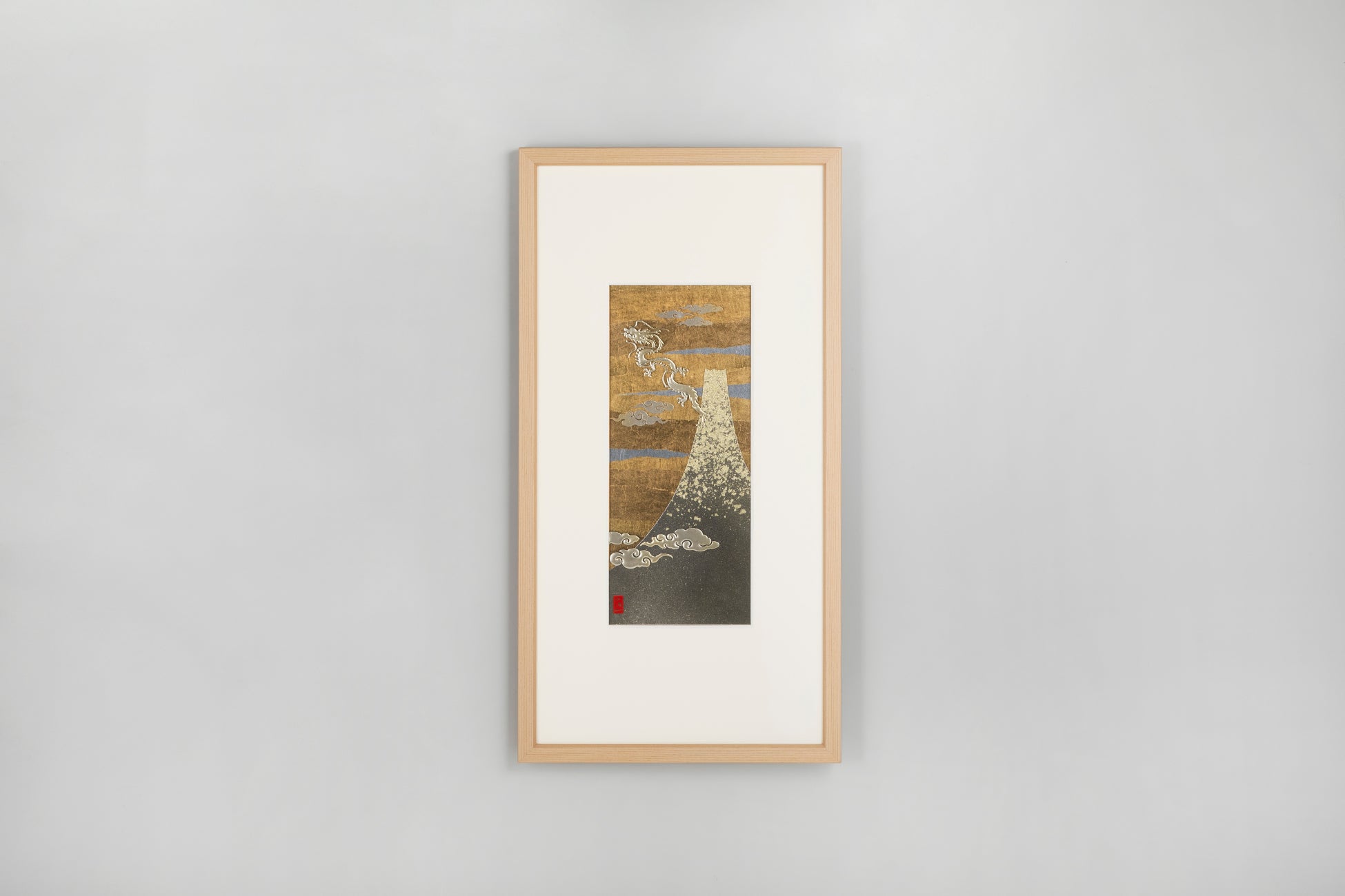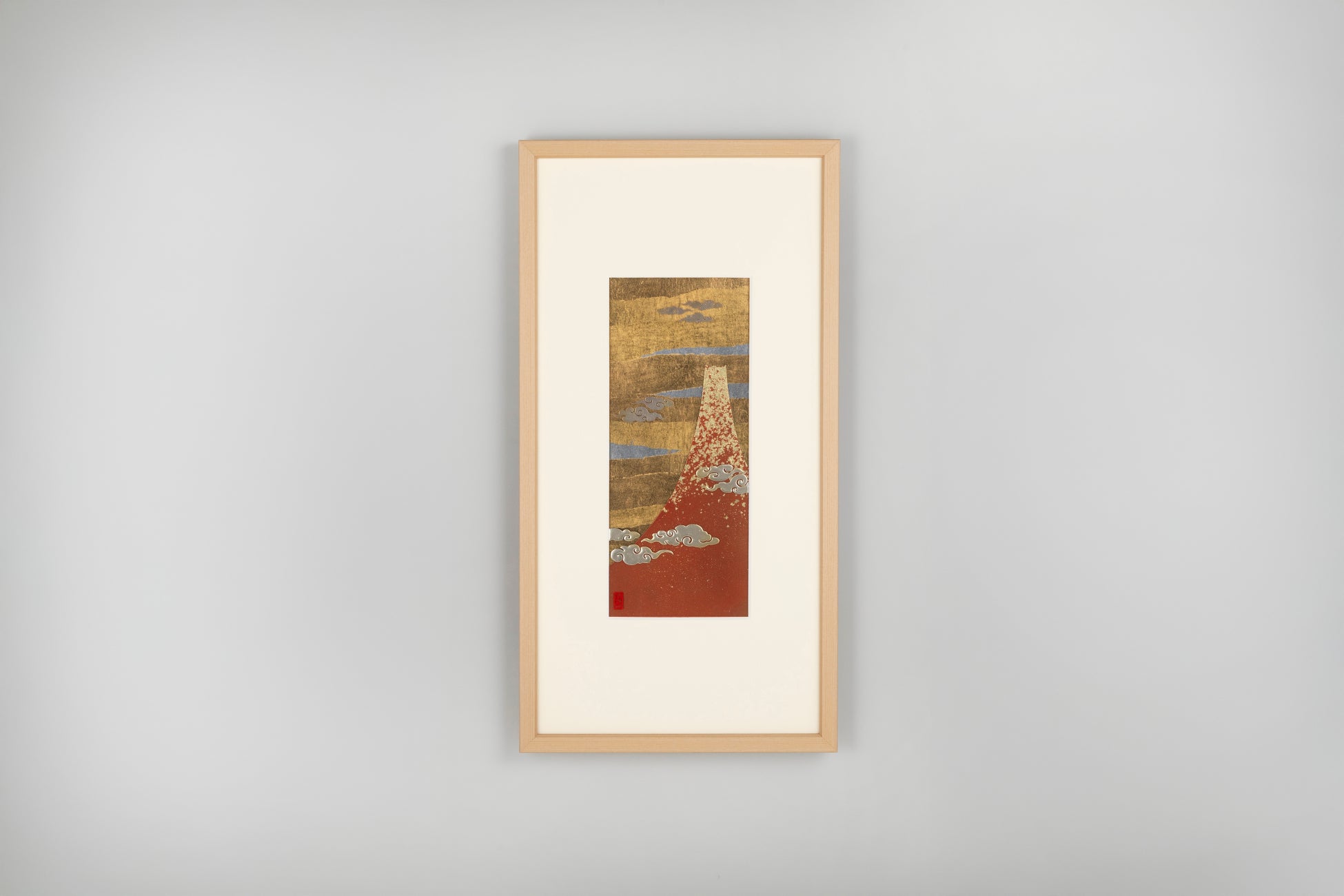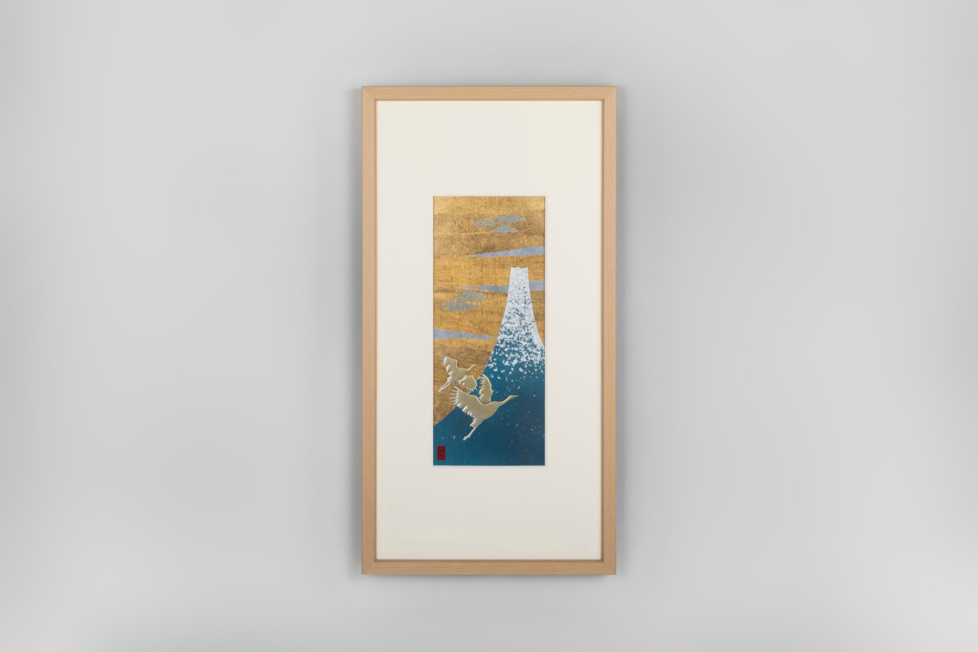 浮世絵は、江戸時代の庶民文化として人気を博しました。やがて欧州に渡ると、モネやゴッホら当代の画家に衝撃を与え、印象画の源流の一つにもなりました。対象を大胆にデフォルメして描く手法や、モチーフを平面的に表現しながらも配置や重なりによって世界感を表現するアイデアは、日本人の感性ならではの優れた美意識といえるでしょう。浮世絵の絵師たちが好んで描いたのが、日本最大の縁起物である富士山です。このシリーズでは日本が誇る浮世絵師である葛飾北斎の富士をモチーフに、箔の持つ多様な色彩と職人の技術を駆使することで、ほかにはない新しいアート作品としました。