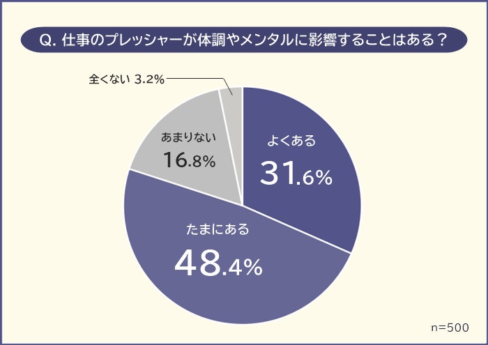 仕事のプレッシャーで体調やメンタルに影響が出たことがあるかという問いには、「よくある」「たまにある」と回答した人が合わせて80.0%にのぼりました。