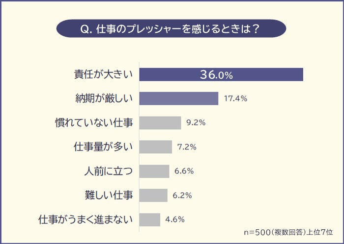 お仕事をしている500人に、仕事のプレッシャーを感じるのはどんなときか聞いたところ、圧倒的1位は「責任が大きいとき(36.0%)」でした。2位「納期が厳しいとき(17.4%)」も多くの票を集めています。