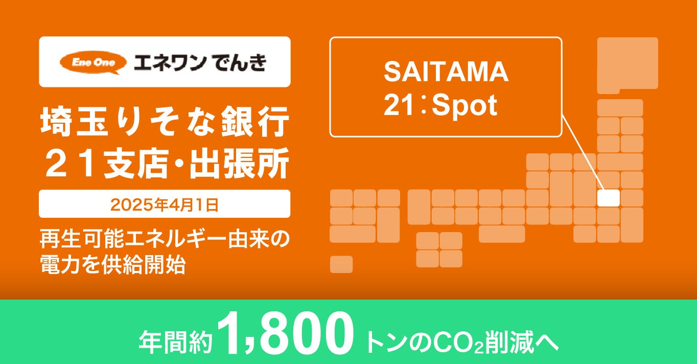 Gas One(ガスワン)グループの基幹である株式会社サイサン(さいたま市大宮区 代表取締役社長 川本 武彦)のグループ会社である株式会社エネワンでんき(本社:東京都千代田区、代表取締役:吉澤 正人、以下「エネワンでんき」)は、株式会社埼玉りそな銀行(本店:さいたま市浦和区 代表取締役社長:福岡 聡、以下「埼玉りそな銀行」)と、このたび埼玉りそな銀行の21の支店および出張所に対し、再生可能エネルギー由来の電力を供給する契約を締結しました。