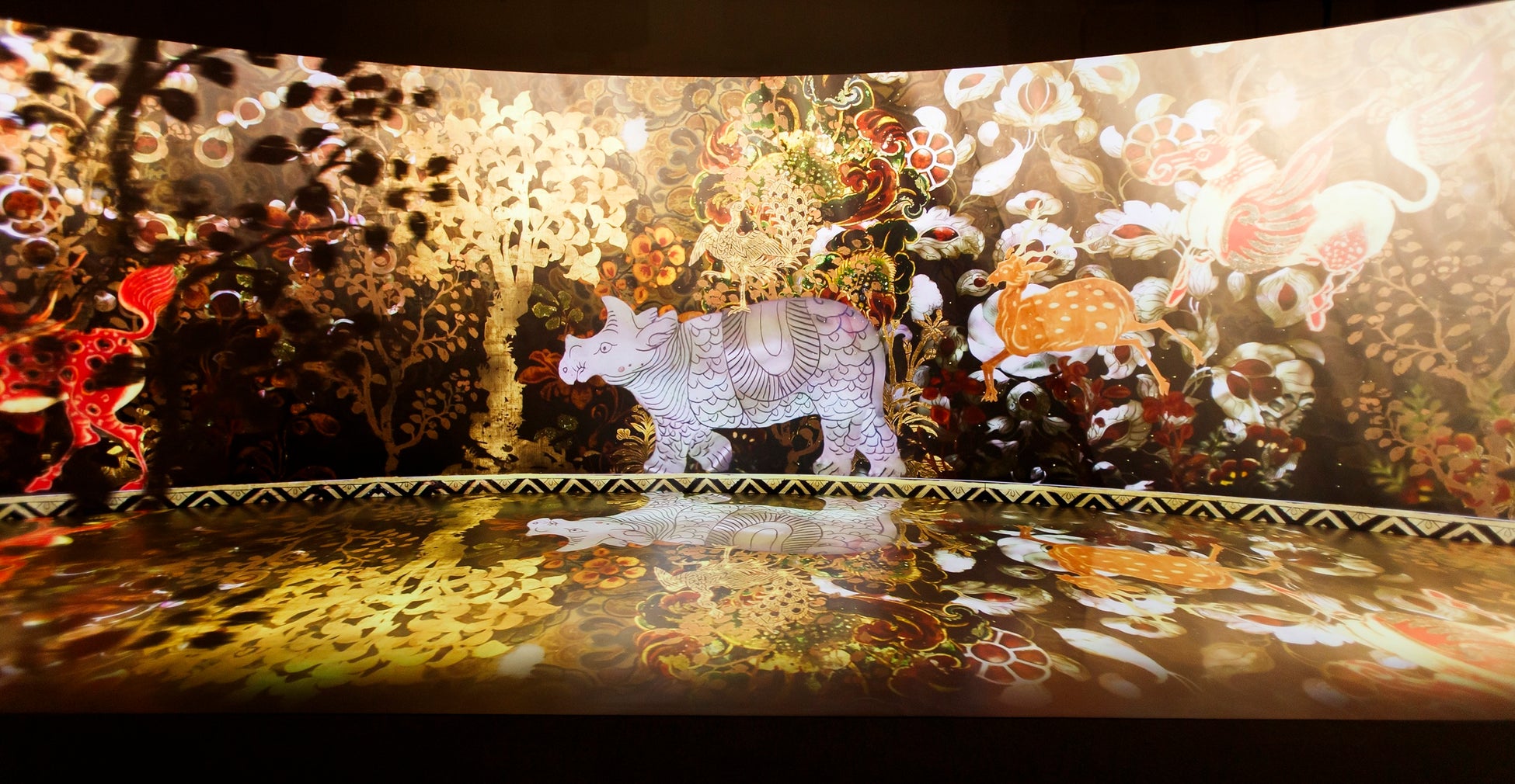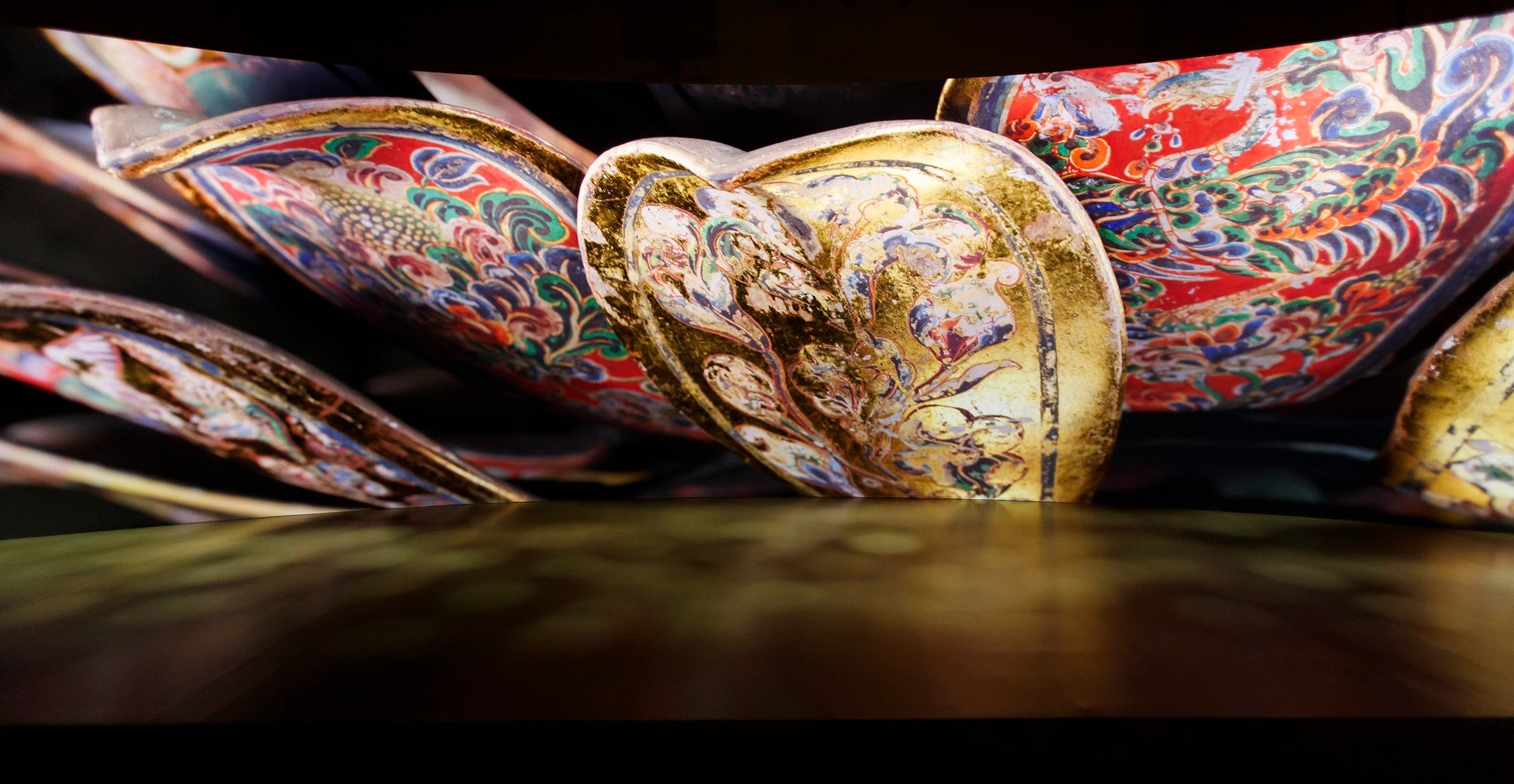 最新の技術で宝物をスキャンして作成した超高精細の映像を、巨大スクリーンで上映。没入感ある空間で、肉眼では捉えられない宝物の美しい意匠の細部や質感を「再現模造」の展示と合わせてたっぷりとご堪能いただけます。さらに、正倉院と宝物をめぐるストーリー映像で正倉院の「ものがたり」を体感いただけます。