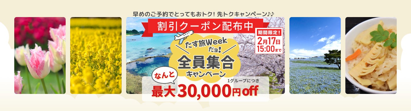 それを記念して定期的に当サイト内で行っているイベント「たす旅Week」の一環として『先トクキャンペーン』を行います。期間中は旅行代金に応じて最大3万円分の割引クーポンを配布します。ぜひこの機会にゴールデンウィーク、夏休み、イベント、推し活など早めの予約でお得に旅してみませんか。