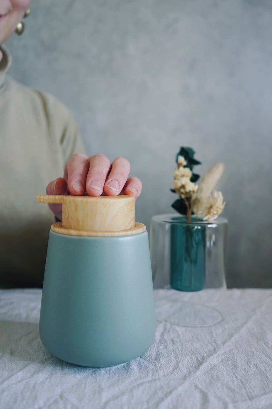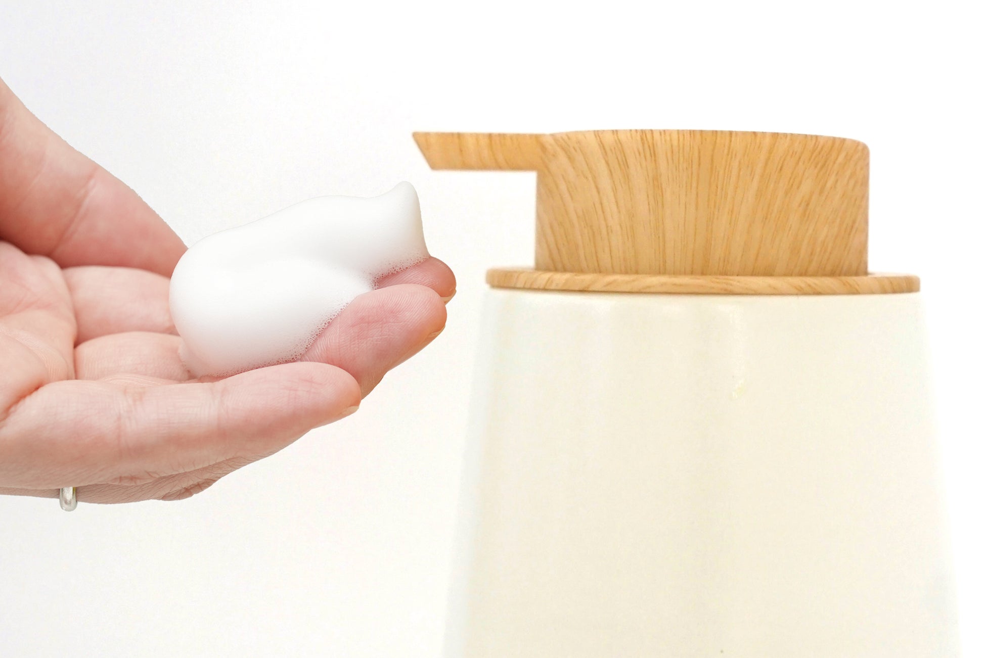 「泡mino」は、300mlの大容量なのにコンパクト、かわいいコロンとしたシルエットが特徴的です。癒しのシルエットと木の質感が、日常を北欧モダンな空間に変えます。