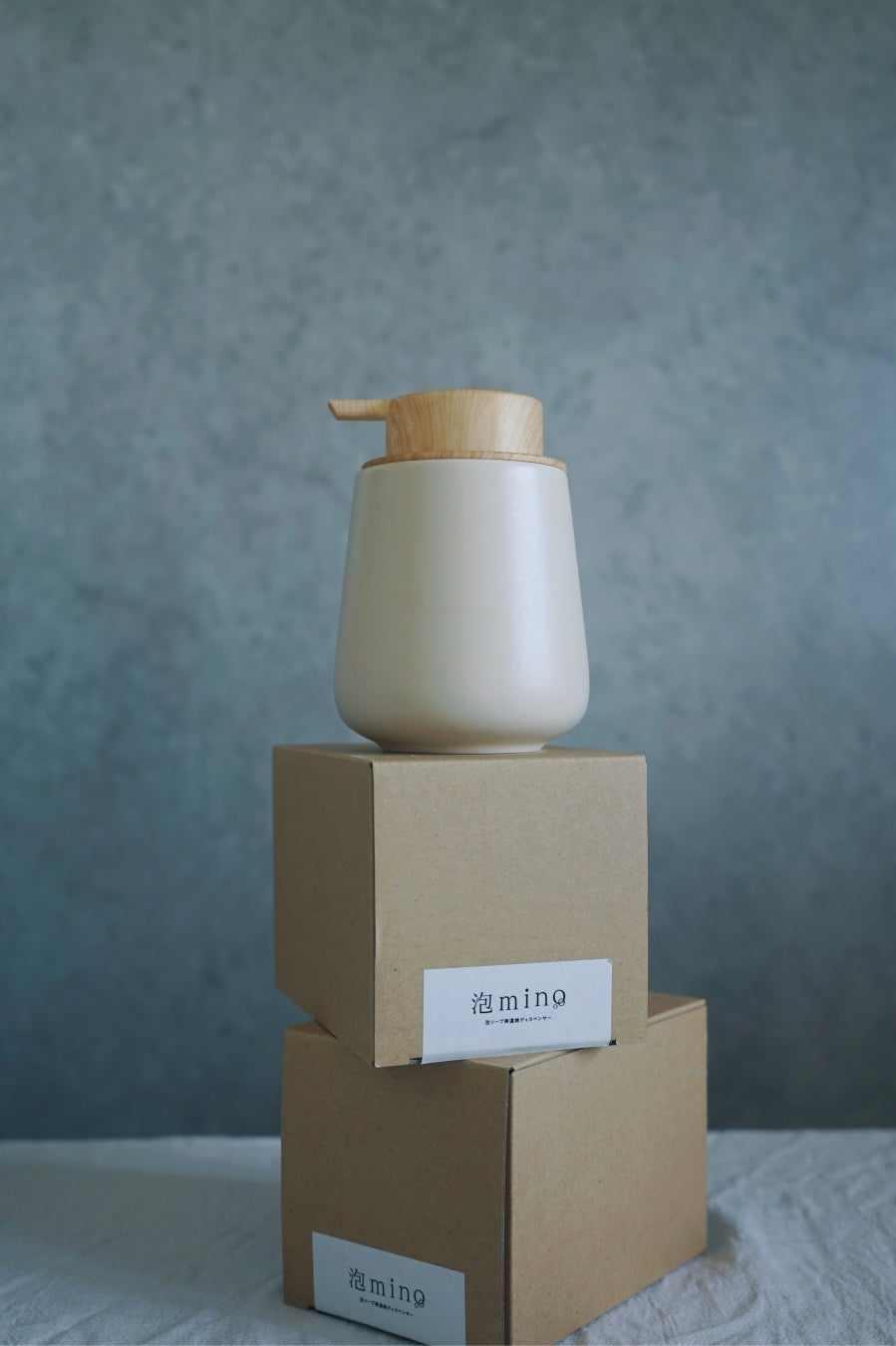 「日本の伝統工芸美濃焼」を採用した本体ボトル部分は、世界で認められた美濃焼ブランドKYOTOHの技術を活用しています。KYOTOHは、岐阜県多治見市において1300年の歴史を持つ美濃焼技法を継承しており、世界三大デザイン賞の一つ「iFデザイン賞」を受賞した経歴があります。KYOTOHが我々「KATAZUKE」の企画に共感し、試行錯誤の末、新たなコラボ商品「泡mino」を皆様にお届けできることとなりました。