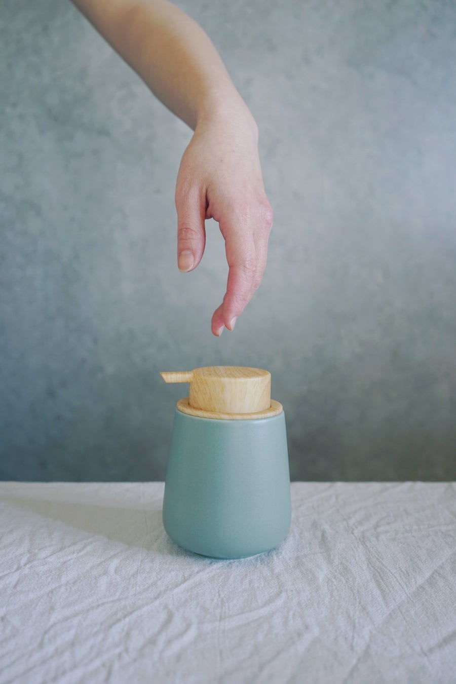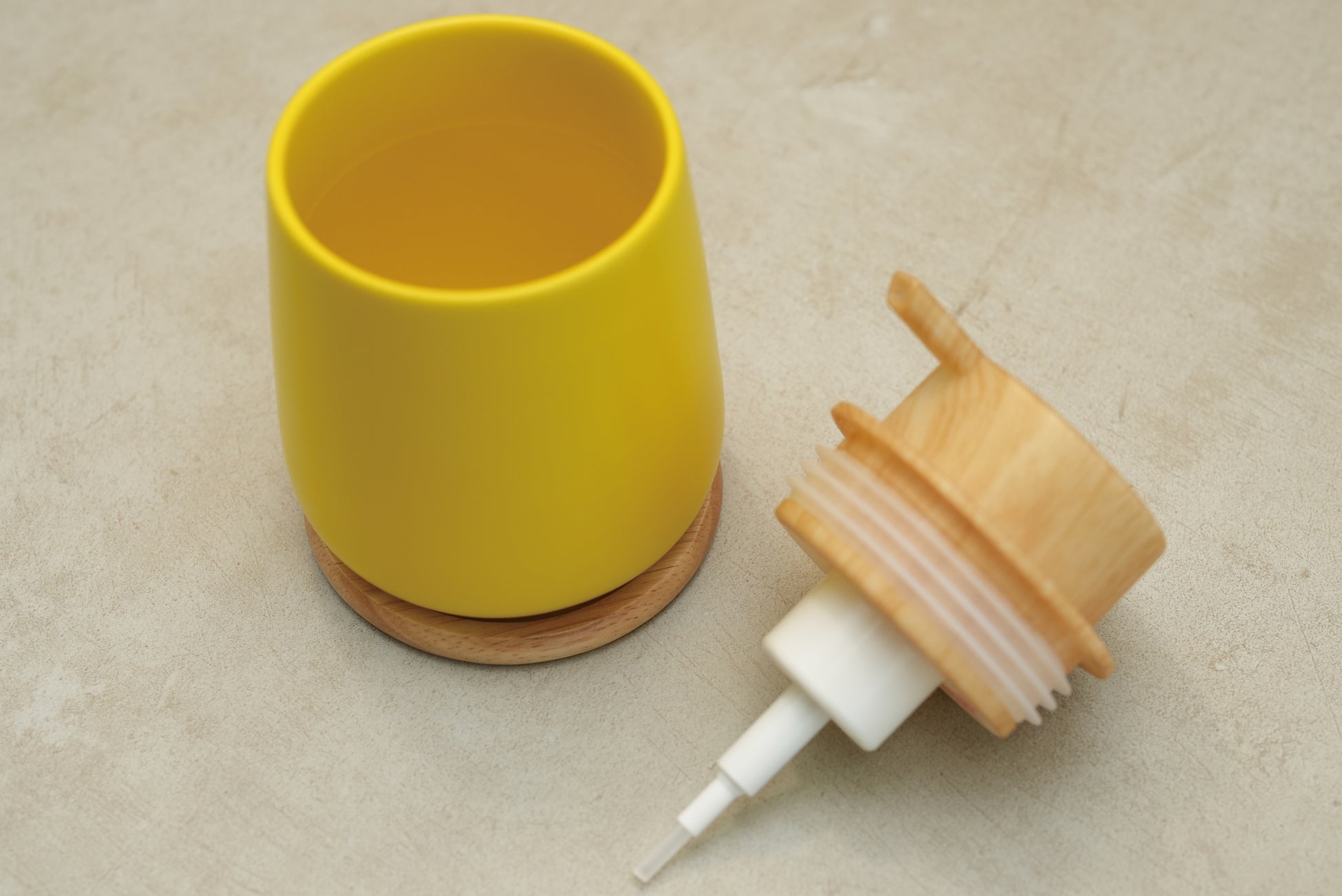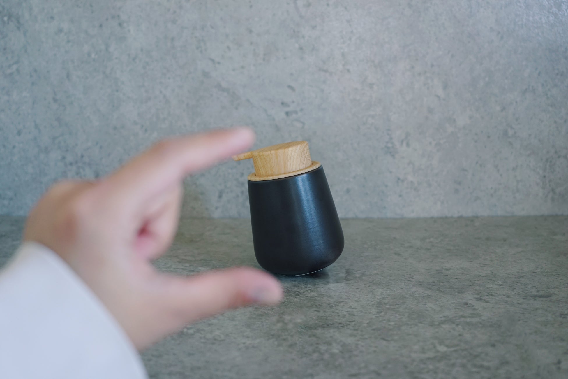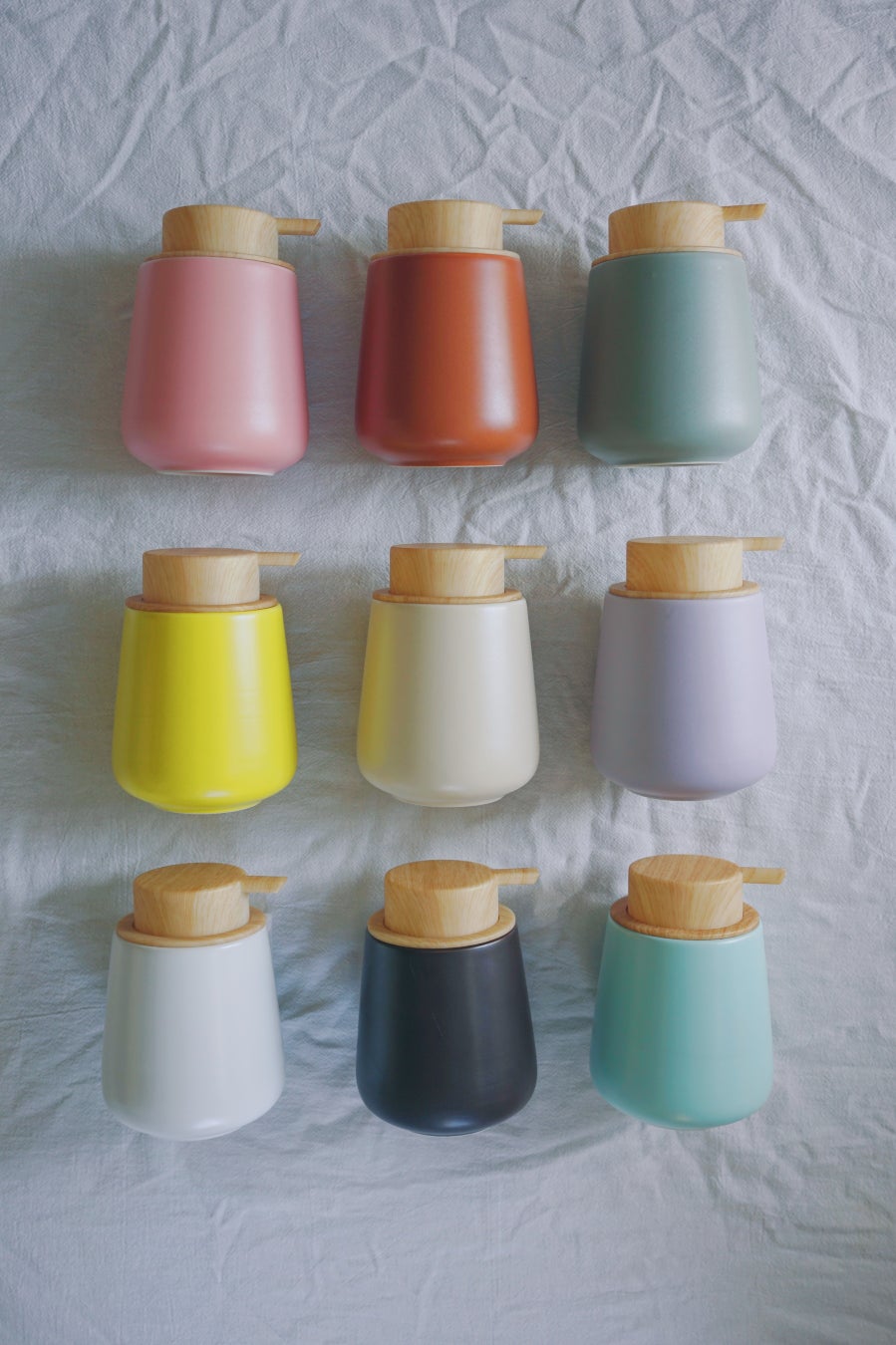 今、インテリアで大人気の北欧デザイン!美濃焼で表現した「セミマット北欧カラー」の本体ときめ細かい泡の出る木目調にデザインした大型ポンプの調和は、多くのお客様に愛されるデザインです。