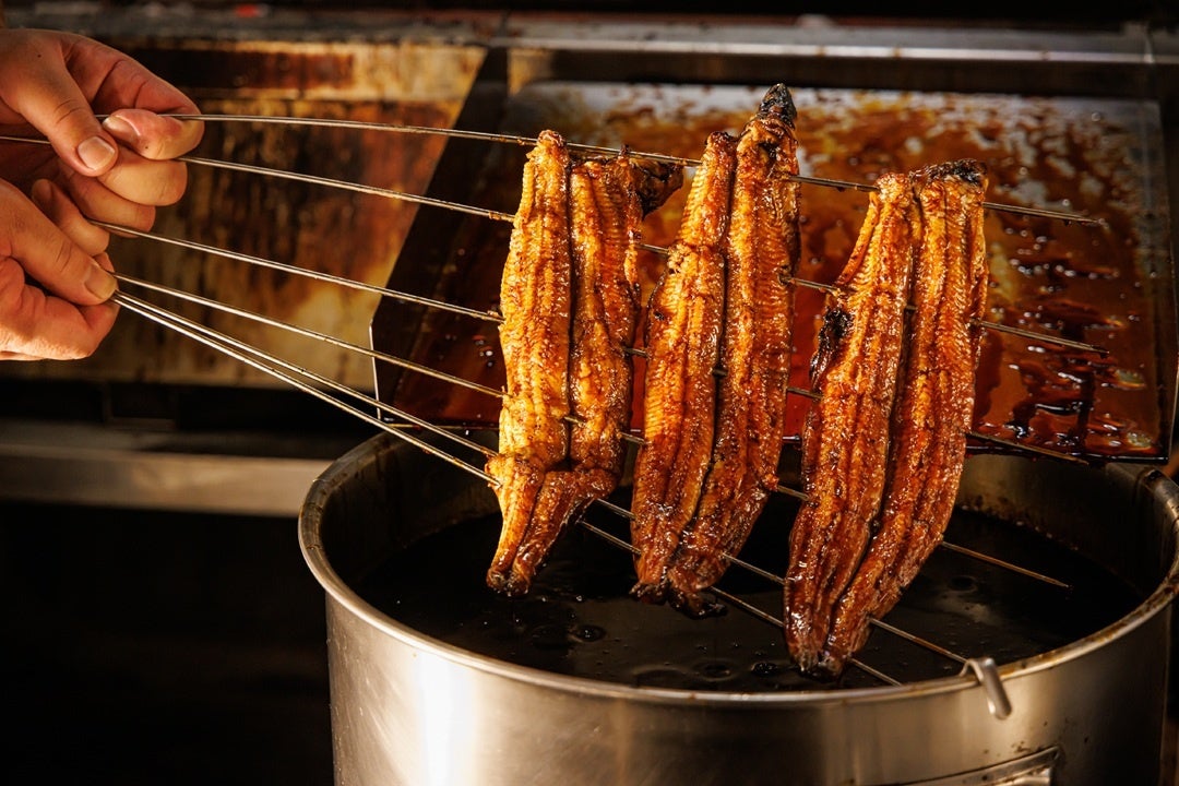 炭火焼きならではの美しい焼き色と香り。うなぎを揉みながら焼く「こなし」の技で、身に空気を含ませ、ふっくら柔らかく仕上げます。