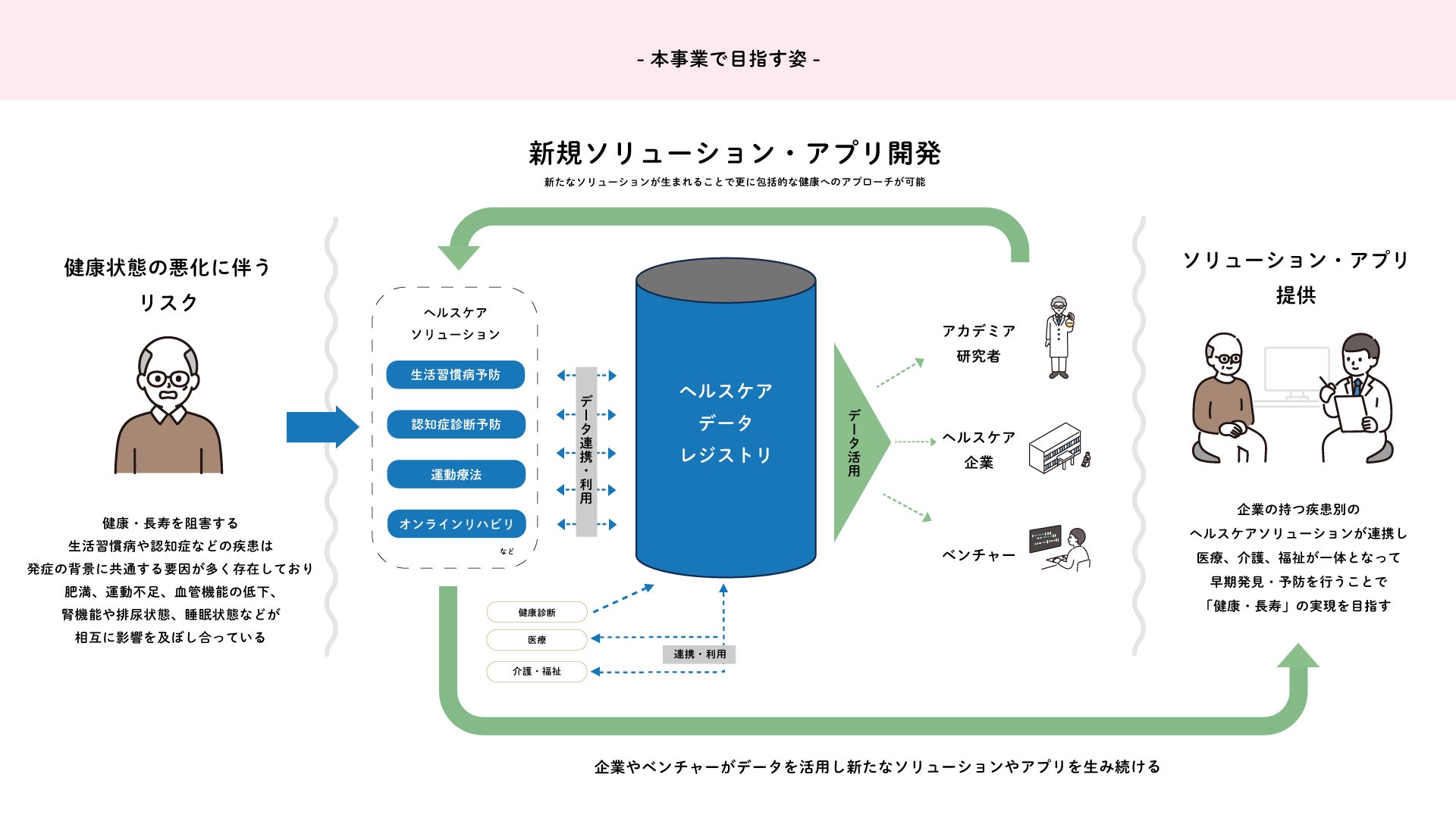 生活習慣病と認知症の予防・早期発見を起点に、個人の健康に包括的にアプローチするソリューションを開発いたします。それらのデータをヘルスデータレジストリに統合し、そのデータの利活用を通じて、健康・長寿に資する新たなソリューションが継続的に生まれるエコシステムの構築を目指します。