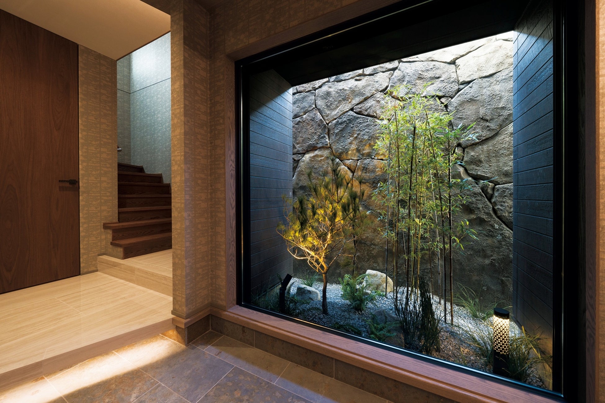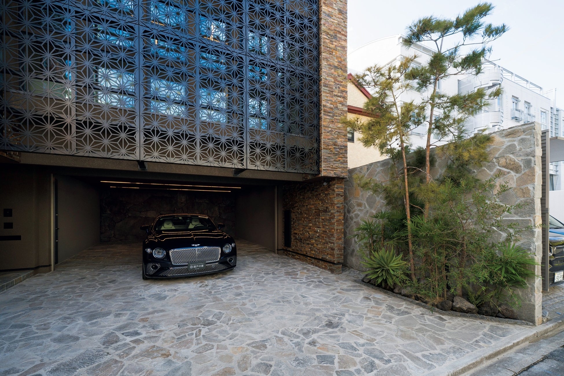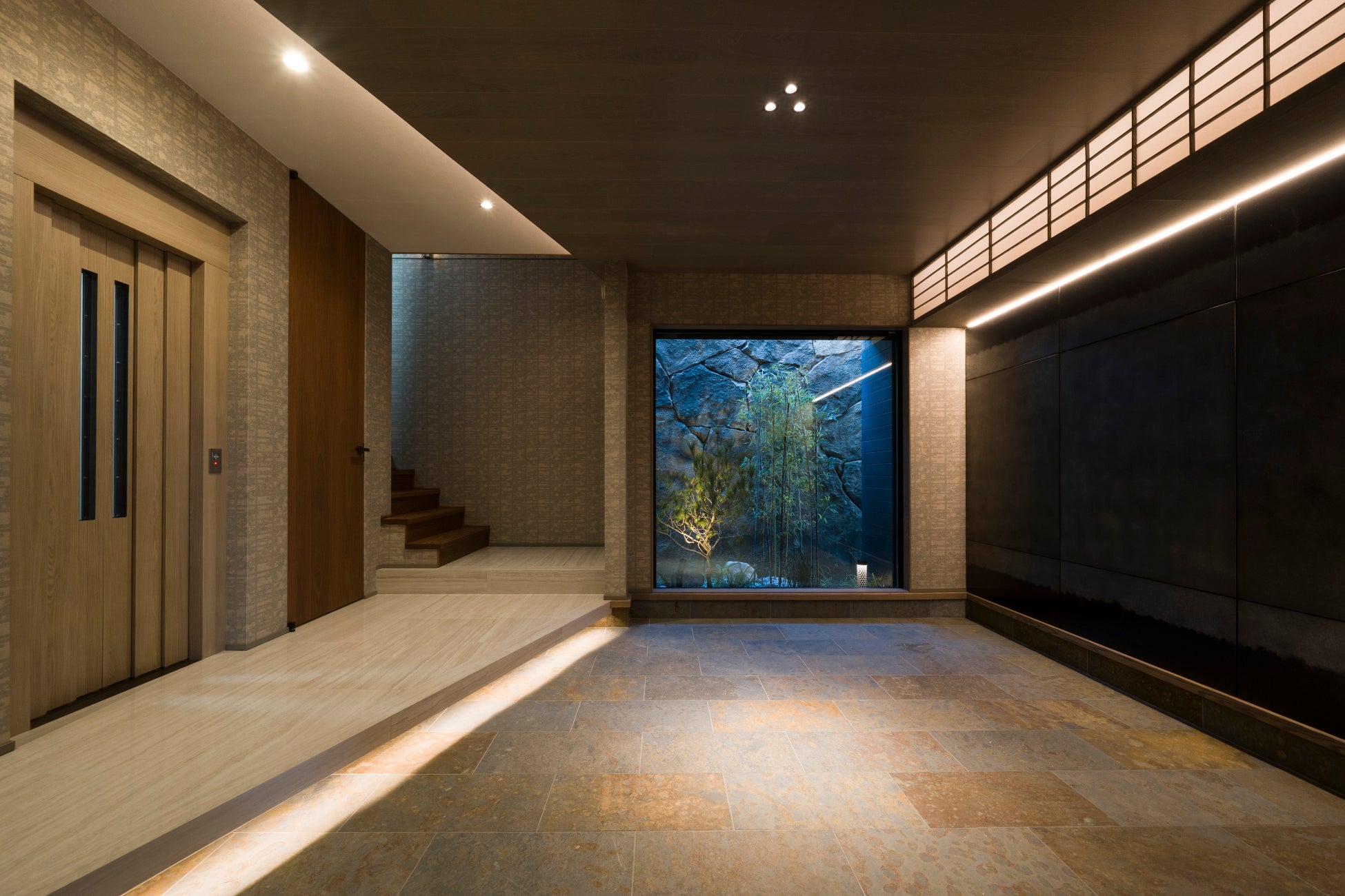 エントランスの坪庭やバルコニーには赤松や黒竹を組み合わせ、球形照明や間接照明によって昼夜で異なる表情を見せる構成としています。ルーフバルコニーには約20種の植物を配置し、邸宅全体に自然の気配を巡らせています。