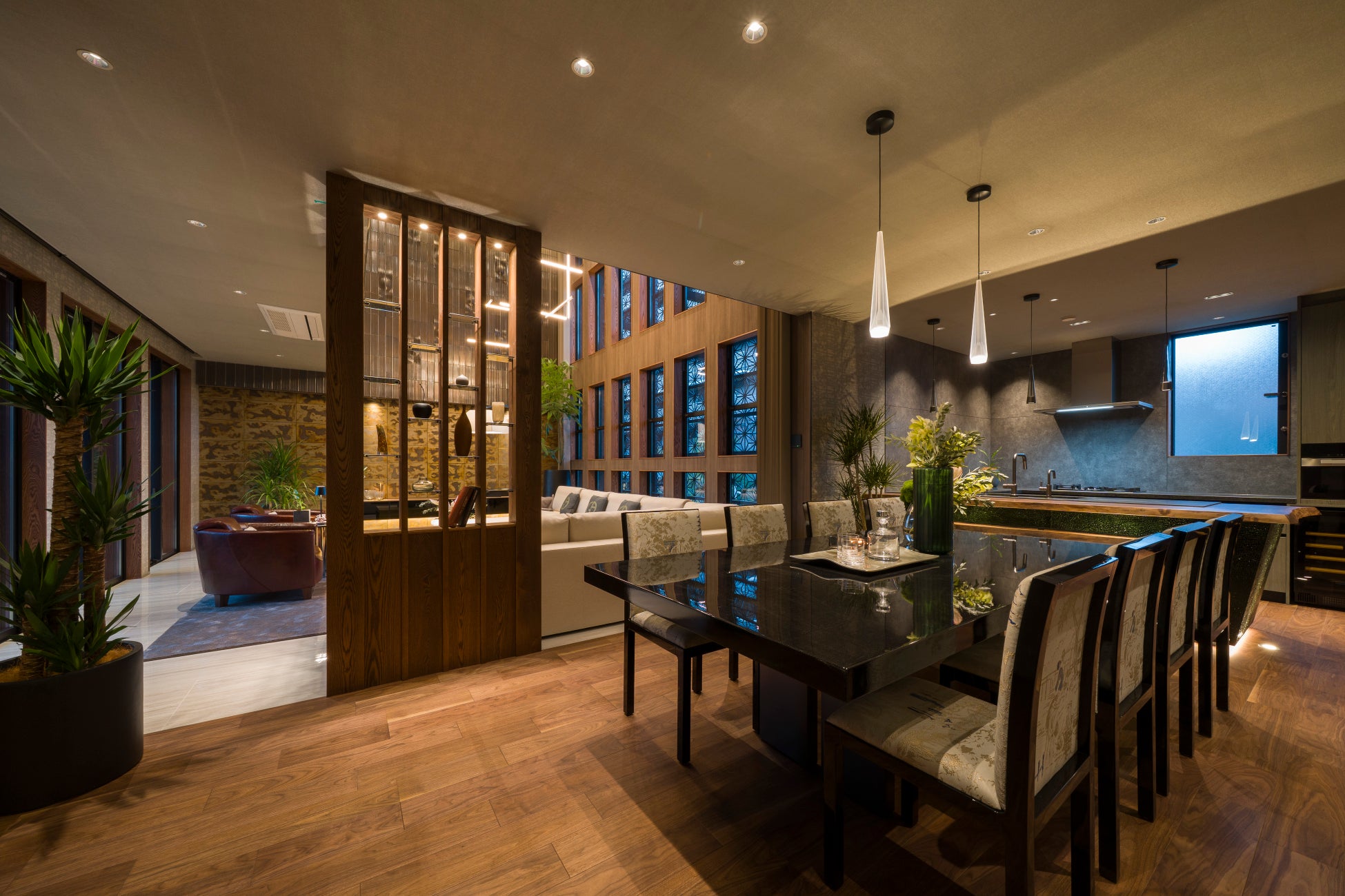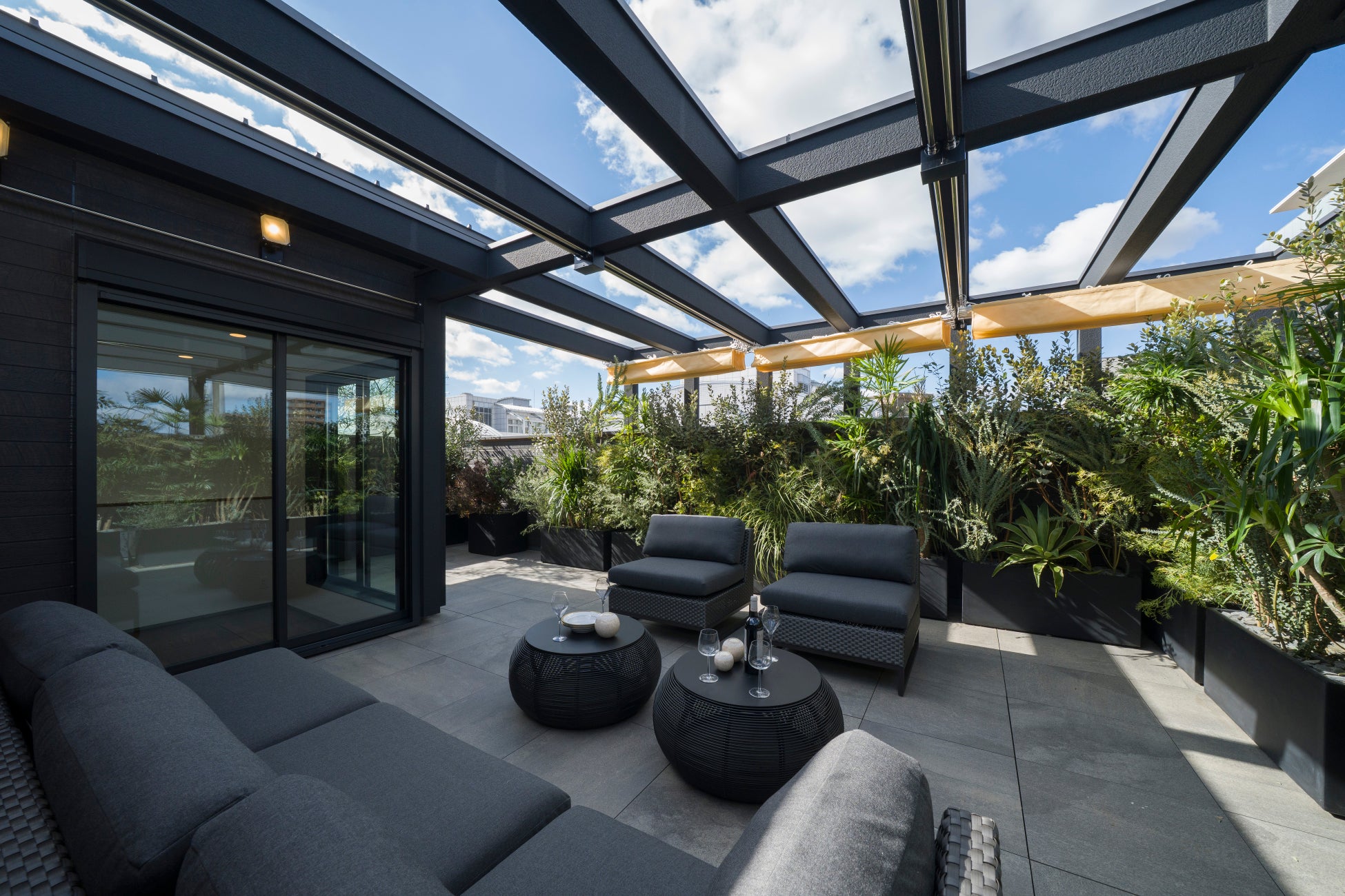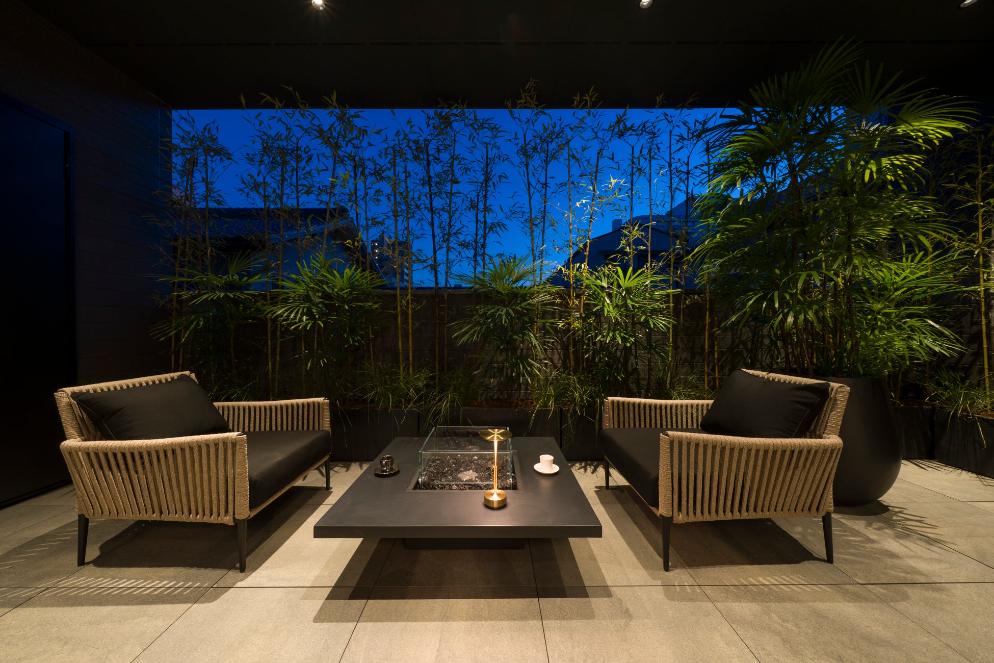 エントランスの坪庭やバルコニーには赤松や黒竹を組み合わせ、球形照明や間接照明によって昼夜で異なる表情を見せる構成としています。ルーフバルコニーには約20種の植物を配置し、邸宅全体に自然の気配を巡らせています。