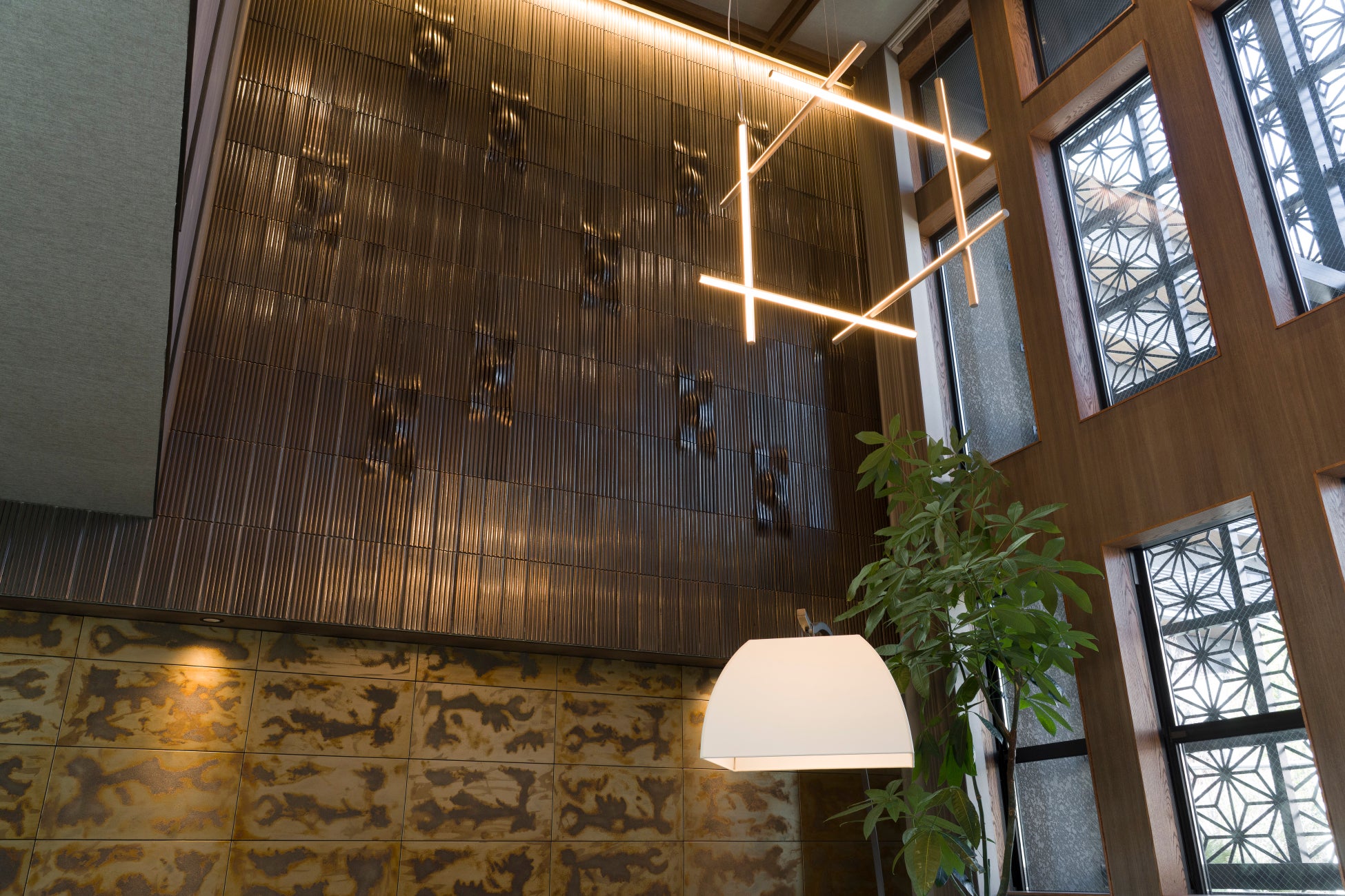 吹き抜け空間の壁面には、タイルアーティスト・山本庸志人氏によるオリジナルタイルを用いた造形が設えられています。タイルは押出成形によって製作され、格子状の構成の中に、削りによって生まれた波のような起伏が点在しています。