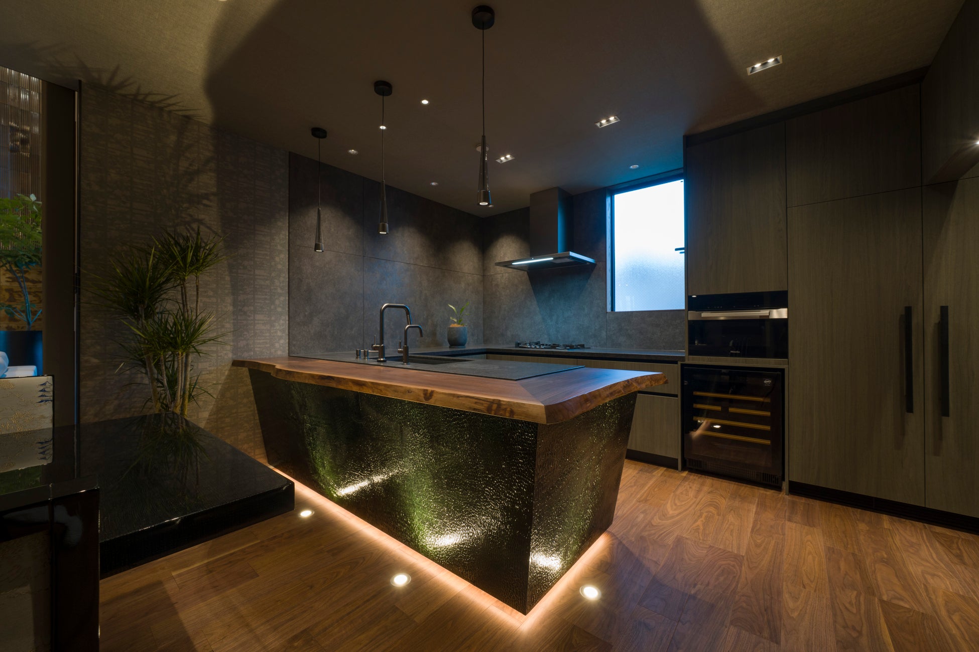 このキッチンの側面や意匠部分には、塗師・牧野昂太氏による漆仕上げが施されています。
