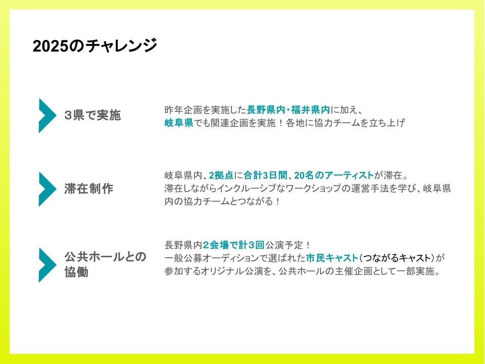 2021年の取り組み開始から5年目を迎える今年は、長野県・福井県・岐阜県を中心に滞在制作やワークショップなどを組み合わせ、2026年以降の各地での「ムーンナイトサーカス」上演に向けて取り組んでいきます。