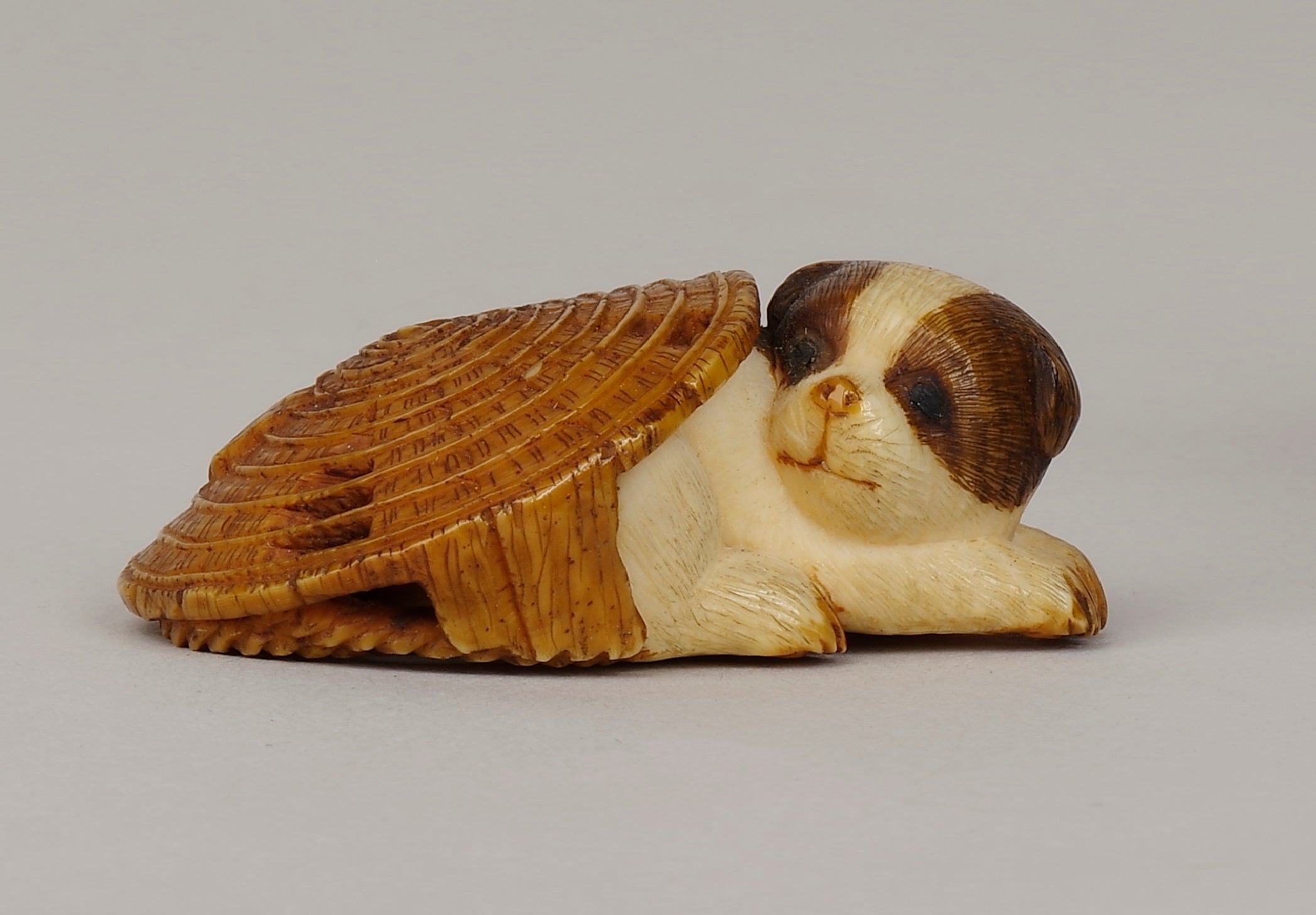蓑笠の下に茶色いぶち模様のある子犬が1匹。象牙には毛筋が1本1本丁寧に彫られています。誰かが笠を被せたのか、それともみずから中に潜り込んだのか、想像が膨らみます。