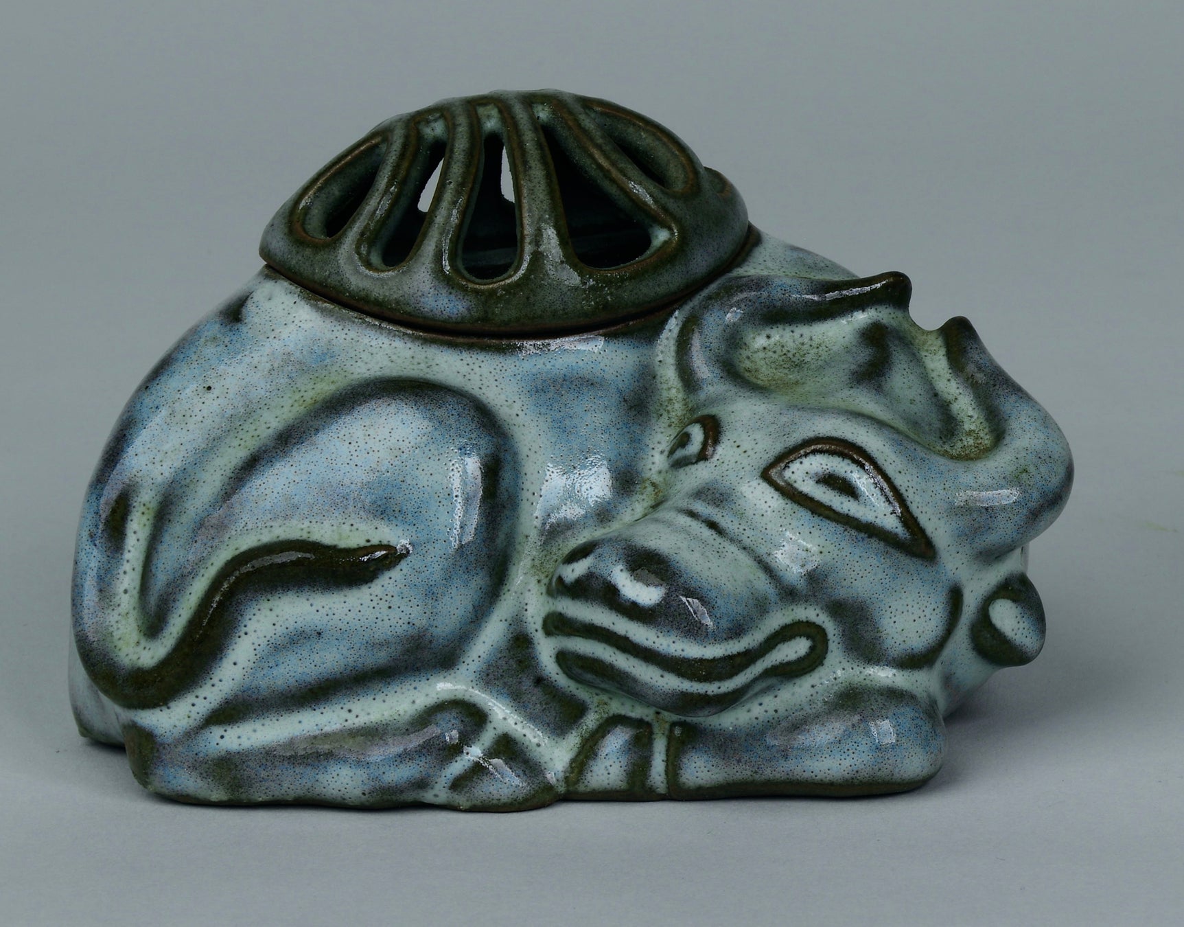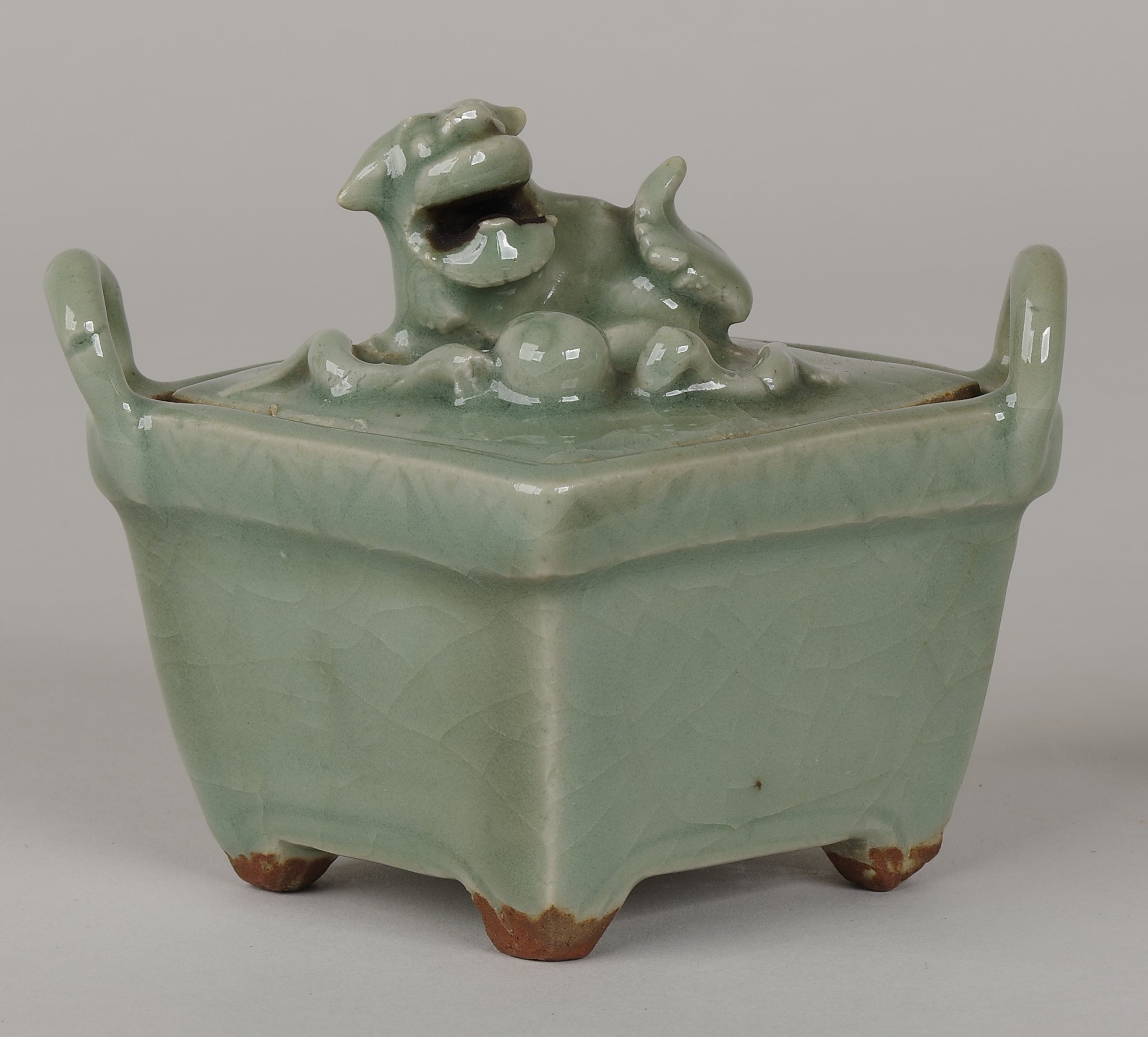 蓋の上に、鞠で遊ぶ獅子が一匹座っています。香炉として用いられており、どうやら口から香りを出していたようです。青磁特有の深い緑色が、視覚からも安らぎを与えてくれます。