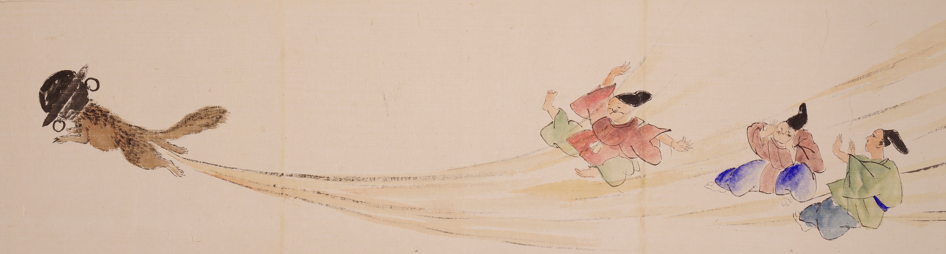 釜を頭にかぶった狸のお尻から勢いよく飛び出す屁は、狸を宙に浮かせるのみならず、人々を遠くに吹き飛ばす有様。スケッチ風の簡素なタッチが、話により面白味を誘います。